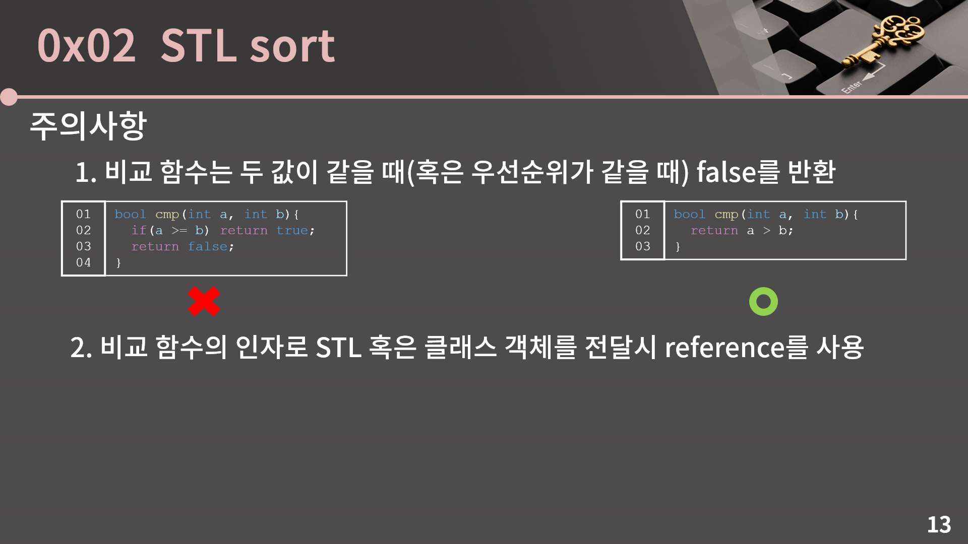 예를 들어 수열을 크기의 내림차순으로 정렬하고 싶을 때 왼쪽과 같이 비교 함수를 작성하면 얼핏 봤을 때에는 문제가 없어보이지만 a와 b가 같을 경우 true를 반환하기 때문에 오류가 발생할 수 있습니다. 오류란게 정확히 어떤거냐면 sort 함수가 도는 과정에서 런타임 에러가 발생할 수 있습니다. 이게 참 웃긴게 비교 함수가 올바르지 않다고 해도 100% 런타임 에러가 발생하는건 아니어서 두 값이 같을 때 true를 반환하는 코드를 제출해도 운이 좋으면 통과될 수 있긴 합니다. 그래도 구글에 STL sort 런타임에러라고 검색해보면 열에 아홉은 지금 이 문제여서 꼭 두 값이 같을 때 false를 반환해야 한다는 점을 기억해야 합니다. 지금 이 코드는 오른쪽과 같이 변경하는게 나아보입니다.