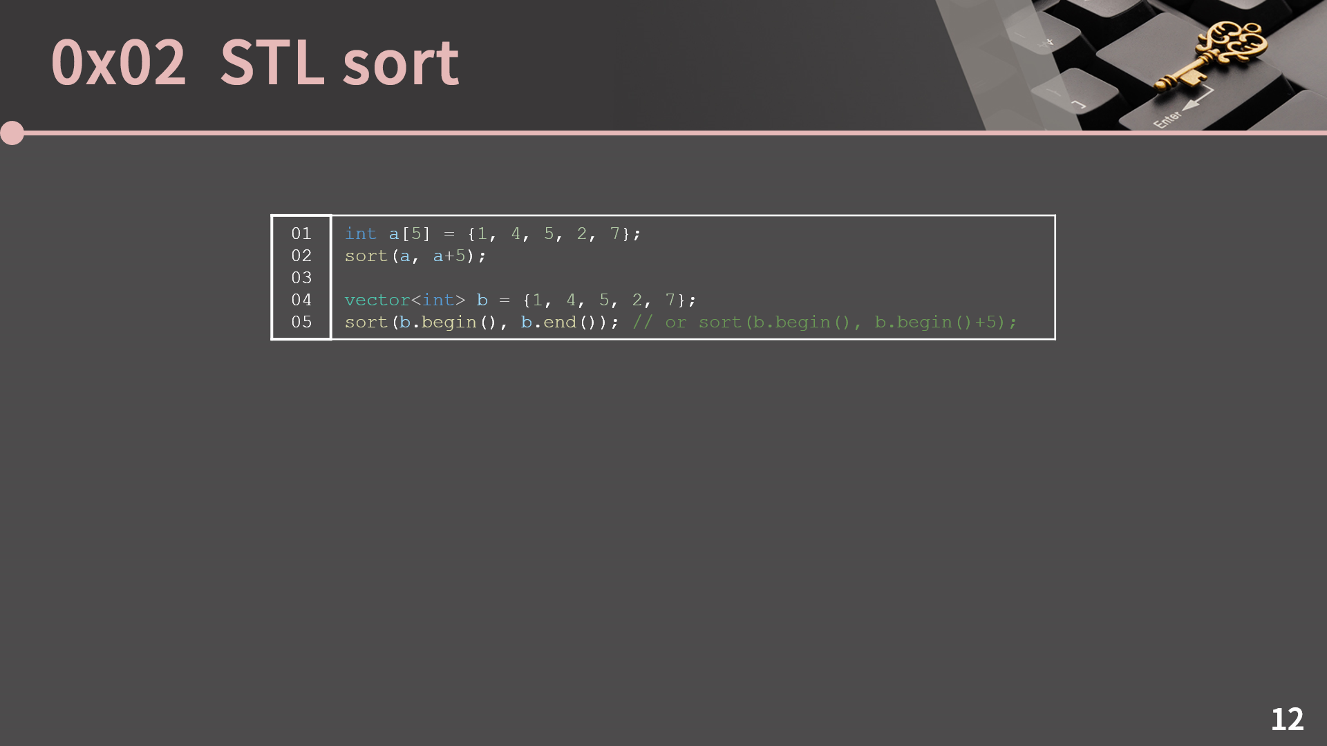 vector에서는 iterator 2개를 넘겨주고 begin(), end()로 건네주면 됩니다. b의 길이가 5일 때 b.end()는 b.begin() + 5이니 두 번째 인자를 b.begin() + 5로 줘도 괜찮습니다. 참고로 STL sort는 퀵 소트를 기반으로 하지만 리스트가 불균등하게 쪼개지는 상황이 계속 반복되어서 재귀에서의 깊이가 너무 깊어지면 O(NlgN)이 보장되는 정렬 알고리즘으로 나머지를 처리합니다. 그래서 STL sort는 최악의 경우에도 O(NlgN)이 보장되기 때문에 마음 편하게 쓰면 됩니다. 더 찾아보고 싶으신 분은 Introspective sort를 검색해보시면 좋을 것 같습니다. 다만 sort 함수는 stable sort가 아닙니다. 그래서 동일한 우선순위를 가진 원소들 사이의 상대적인 순서가 보존되지 않을 수 있습니다. 꼭 stable sort가 필요하다면 stable_sort 함수를 사용하면 됩니다. stable_sort 또한 sort 함수와 사용법이 똑같아서 자세한 설명은 생략하겠습니다.