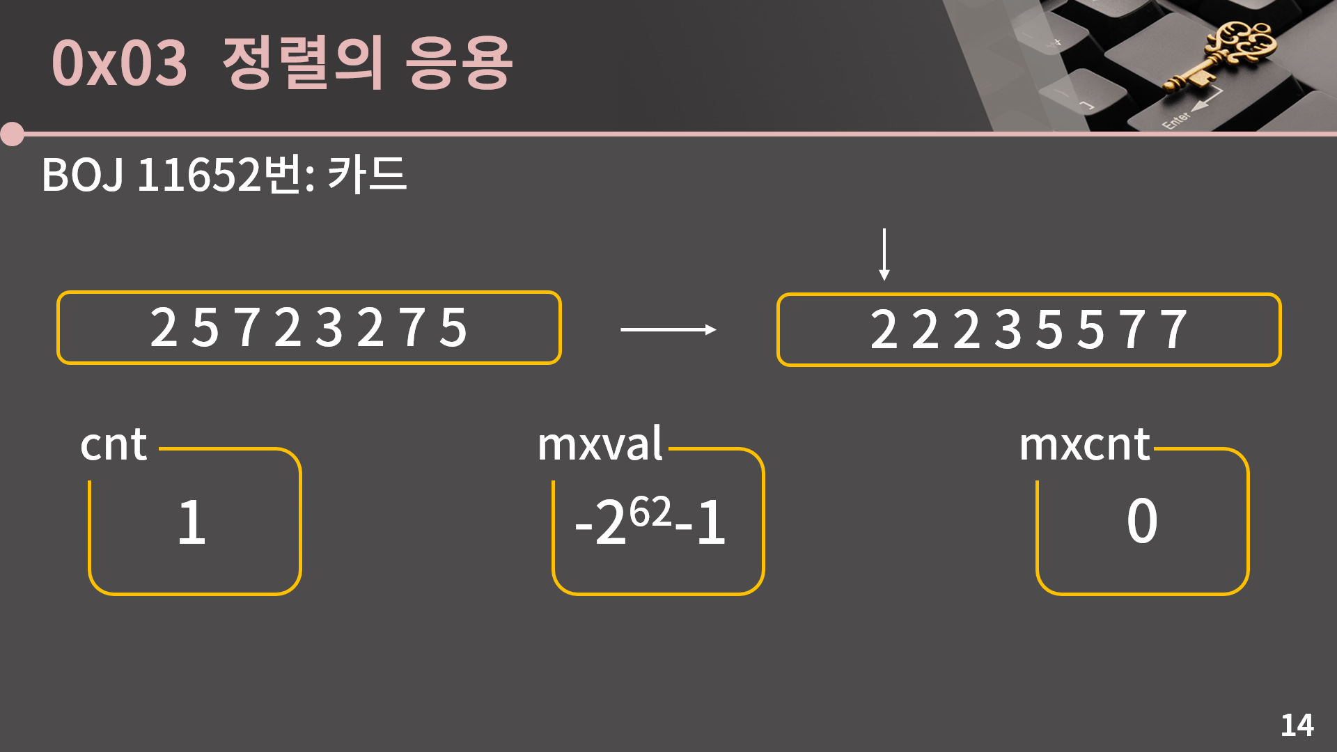 일단 저의 구현에서는 중요한 역할을 하는 변수가 3개 있습니다. 각각의 이름은 cnt, mxval, mxcnt이고 cnt는 현재 보고 있는 수가 몇 번 등장했는지, mxval은 현재까지 가장 많이 등장한 수의 값, mxcnt는 현재까지 가장 많이 등장한 수의 등장 횟수입니다. 일단 초기 값으로 cnt는 0, mxval은 -2^62-1, mxcnt는 0을 주겠습니다. mxval이 -2^62-1인 이유는 등장 가능한 수의 최솟값보다 더 작은 값으로 초기값을 둔 것이지만, 사실 mxval은 적어도 한 번은 갱신이 일어나기 때문에 처음 들어가있는 값은 크게 중요하지 않습니다. 이제 수들을 앞에서부터 차례로 보면서 이 변수들의 값을 변화시켜줄 예정입니다.