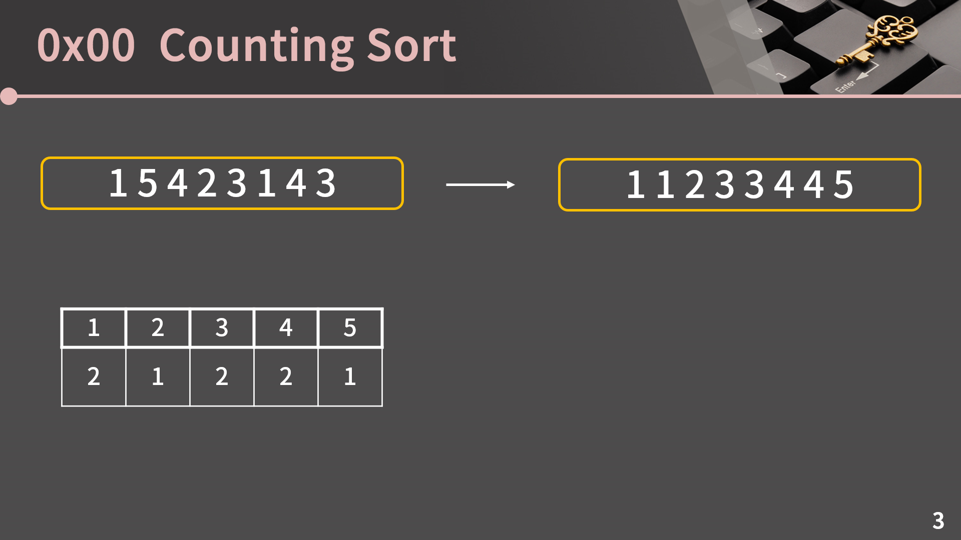 이 표의 의미를 아시겠나요? 이 표는 1이 수열에서 2번 나왔고 2는 1번 나왔고 3은 2번, 4는 2번, 5는 1번 나왔다는걸 의미합니다. 이 표를 보고 수열을 어떻게 정렬할지 생각해봅시다.