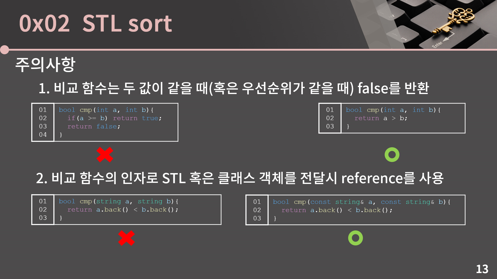 주의사항 두 번째는 reference에 관한 부분입니다. 문자열을 받아서 끝자리의 알파벳 순으로 정렬하고 싶다고 하면 비교 함수를 왼쪽과 같이 작성하면 결과가 정상적으로 나옵니다. 그런데 이렇게 작성을 하면 별로 바람직하지 않습니다. 0x02강에서도 잠깐 언급했지만 함수의 인자로 STL이나 구조체 객체를 실어서 보내면 값의 복사가 일어나는데 지금 이 비교 함수를 생각해보면 굳이 복사라는 불필요한 연산을 추가로 하면서 시간을 잡아먹을 필요가 없습니다. 그래서 복사를 하는 대신 reference를 보내는게 더 바람직합니다.