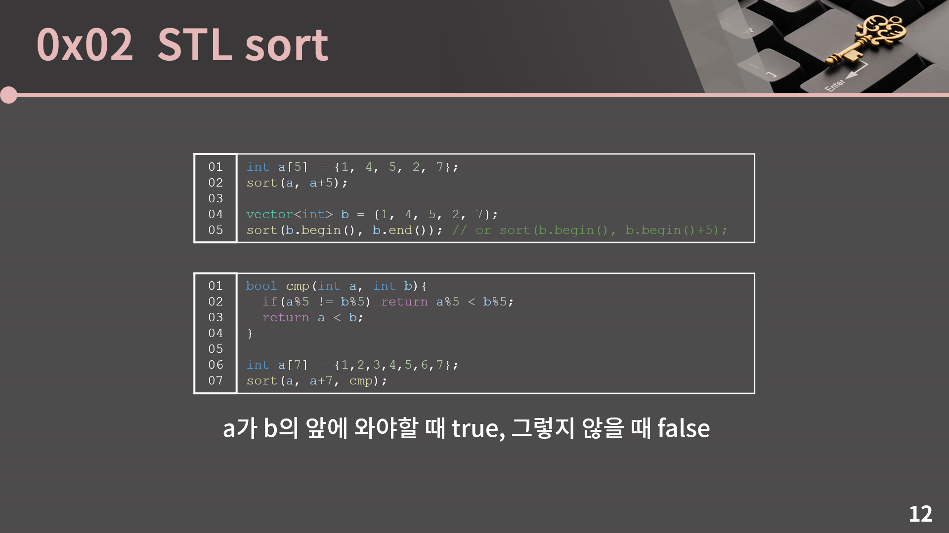 STL sort에는 아주 강력한 기능이 하나 더 있는데, 비교 함수를 내가 정해서 넘겨줄 수 있습니다. 예를 들어 int형을 크기 순으로 정렬하고 싶으면 위의 코드와 같이 하면 되는데 int형을 5로 나눈 나머지 순으로, 5로 나눈 나머지가 같다면 크기 순으로 정렬하고 싶다고 해보겠습니다. 그럴땐 아래의 코드와 같이 비교 함수를 만들어서 인자로 주면 됩니다. 이렇게 하면 배열 a가 5, 1, 6, 2, 7, 3, 4로 정렬됩니다. 이처럼 비교 함수 cmp(int a, int b)는 a가 b의 앞에 와야할 때 true를, 그렇지 않을 때에는 false를 반환해야 합니다.