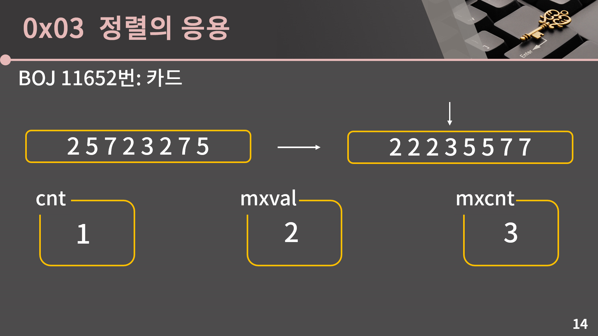 일단 지금 주어진 리스트를 놓고 뭔가를 해보려고 하면 뭐 할 수 있는게 없습니다. 대신 이번 단원에서 배운걸 이용해서 정렬을 해놓고 나면 뭔가 좀 희망이 보입니다. 정렬의 특성상 같은 수들끼리는 인접하게 붙기 때문입니다. 이렇게 정렬이 된 이후에는 O(N)에 해결이 가능한데 한 번 방법을 고민해보는 시간을 가져보겠습니다. 즉, 저렇게 정렬된 상태에서 2가 3번 나오고, 3이 1번 나오고, 5가 2번 나오고, 7이 2번 나오는걸 효율적으로 알아내는 방법을 고민해보겠습니다.