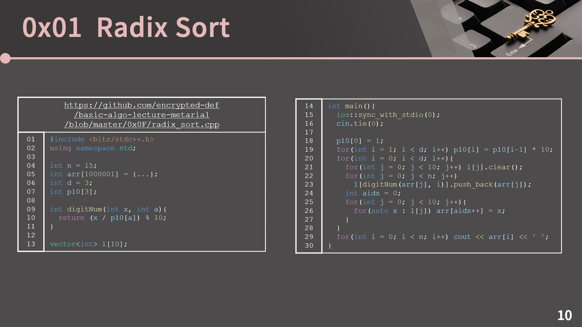 digitNum 함수는 x에서 10a 자리를 추출하는 함수입니다. 예를 들어 digitNum(253, 1)은 253에서 10의 자리인 5를 반환합니다. vector<int> 배열 l은 0번에서 9번 리스트를 나타내고, p10[i]은 10i를 저장할 변수인데 그 값을 18, 19번째 줄처럼 하는게 정석입니다. 무심코 pow 함수를 써서 p10[i] = pow(10, i); 와 같은 방식으로 하면 pow는 실수형을 반환하는 함수이기 때문에 실수 오차로 인해 꼬여버릴 수 있다는 점 꼭 인지하시고 혹시 다음에라도 정수 거듭제곱을 계산해야 하면 pow 함수 대신 지금 이 코드와 같은 방식으로 작성해야 합니다.