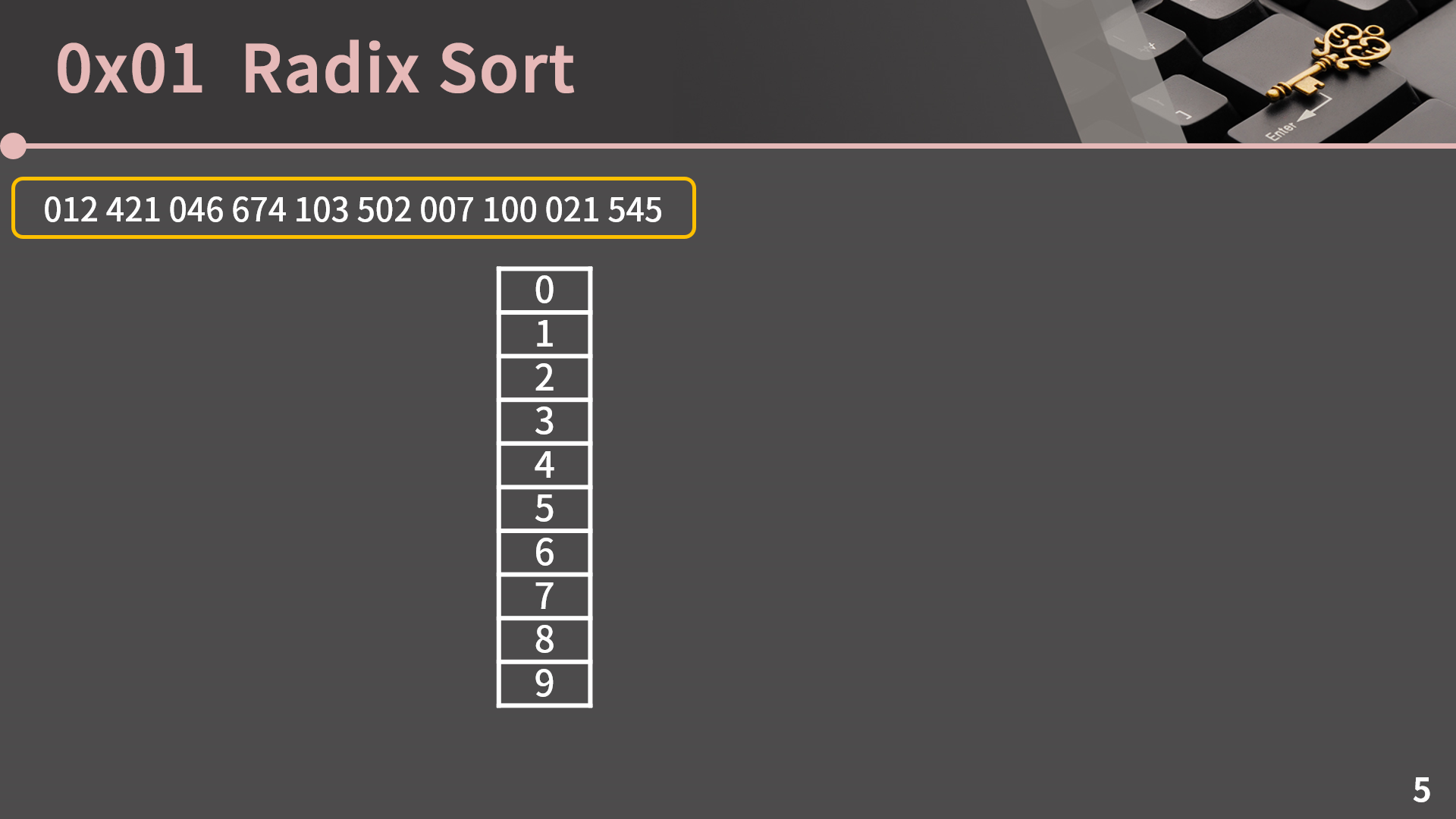 라딕스 소트는 자릿수를 이용해서 정렬을 수행하는 알고리즘으로, 카운팅 소트를 응용한 알고리즘이라고도 생각할 수 있습니다. 일단 알고리즘이 어떻게 굴러가는건지 같이 살펴보겠습니다. 지금 보시는 이 10개의 수를 라딕스 소트로 정렬해보겠습니다. 012, 007 이런건 그냥 12, 7인데 설명의 편의를 위해 0을 앞에 붙여놨습니다. 과정을 보다보면 0을 붙여서 나타낸 이유를 이해할 수 있을 것입니다.