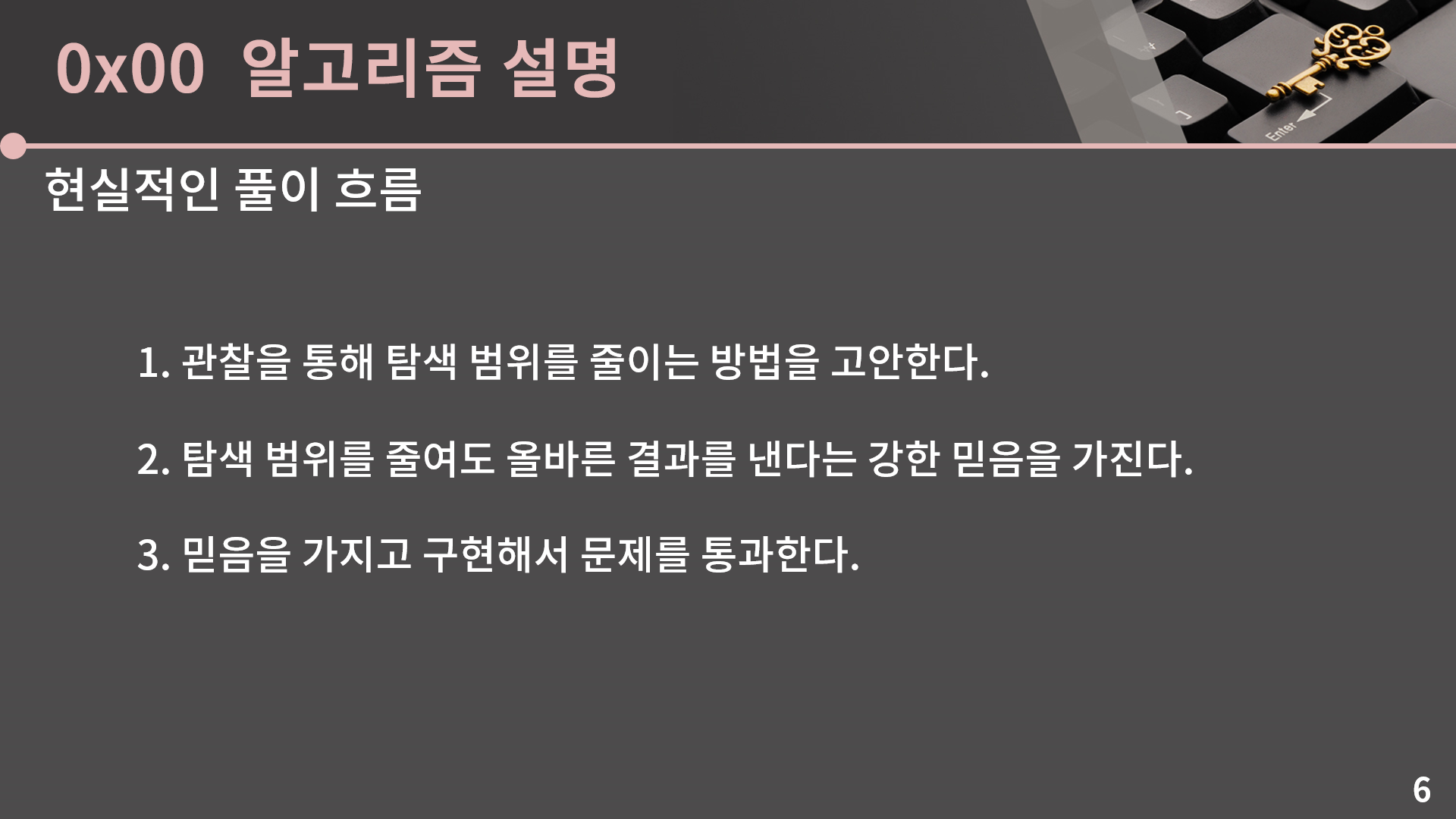 그러면 일반적으로 그리디 알고리즘을 푸는 방법은 뭐냐고 했을 때 이런 흐름을 거치면 가장 적절합니다. 일단 직관적으로 보이는 풀이의 시간복잡도로는 문제의 시간 제한 안에 들어올 수 없을 때 시간복잡도를 더 낮출 수 없을까 관찰을 합니다. 그러다가 뭔가 그럴싸해보이는 방법이 생각나면 그 방법이 올바른 결과를 낸다는 사실을 수학적으로 완벽하게 증명한 후에 구현해서 문제를 통과하면 됩니다.