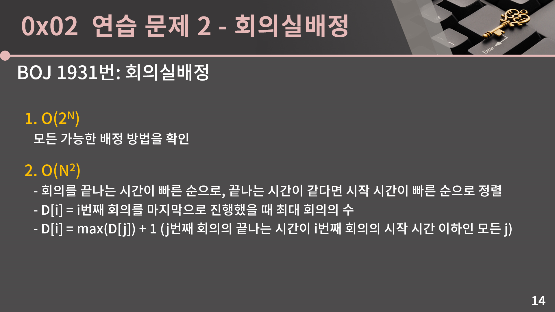 일단 시간복잡도를 연연하지 말고 그냥 문제를 해결하는 방법을 생각해보면 O(2N)개의 모든 가능한 배정 방법을 확인하는 다소 무식한 풀이도 떠올릴 수 있고 배운 사람 답게 DP를 써서 O(N2)으로 풀이할 수도 있습니다. DP로 문제를 풀려고 하면 회의를 정렬해두고 나보다 먼저 끝나는 회의에 대응되는 DP 값에서 1을 더하는 방식으로 식을 정의하면 됩니다. 그러면 각 칸을 채울 때 이전의 모든 회의를 모두 살펴봐야 하니 시간복잡도는 O(N2)에 해결할 수 있습니다. DP 풀이도 그렇게 간단하지는 않고 여기까지 떠올리셨다면 내가 전 단원 내용을 잘 학습했구나 하고 뿌듯해하셔도 좋습니다만 아쉽게도 여전히 이 문제를 해결하기엔 시간복잡도가 아직 큽니다. 이런 상황에 마주했다고 하면 머리를 이리저리 굴려보게 됩니다. 일단 DP로 뭔가 가닥이 잡히는 것 같으니까 혹시 각 칸의 값을 구할 때 이전의 모든 회의를 보는 대신 더 줄일 수는 없을까 이런식으로 풀이를 발전시키려고 머리를 굴리다 보면 뭔가 그리디한 풀이가 감이 올 수 있습니다.