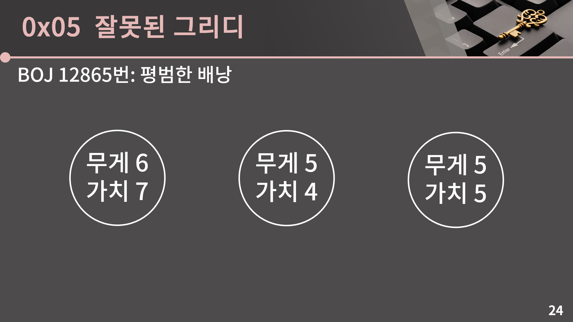 하지만 이렇게 물건 3개가 있고 제한이 10이라면 2, 3번 물건을 챙겨 가치 9를 얻는게 최적인 반면 그리디 풀이는 1번 물건을 챙겨 가치 7을 얻게 됩니다. 이 문제는 0-1 knapsack이라는 이름이 붙어있는 문제이고 나름 유명한 DP 문제이니 심심하시면, 사실 안심심하셔도 한 번 풀어보시는 것을 추천드립니다.