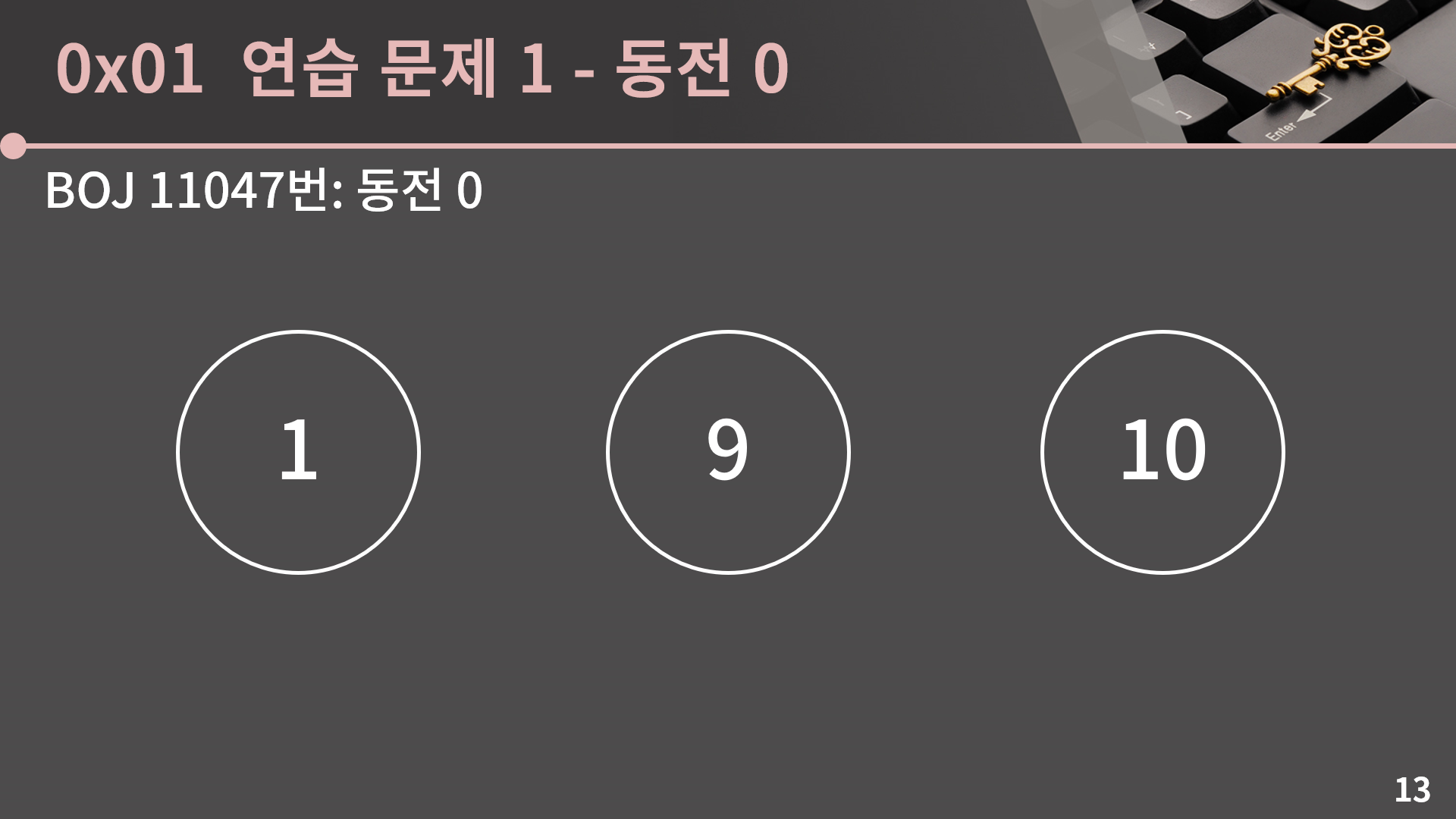 이제 그리디로 풀 수 있는 문제들을 풀어보겠습니다. 맨 처음 풀 문제는 BOJ 11047번: 동전 0 문제입니다. 이 문제는 우선 DP로 해결이 가능합니다. 비록 DP 단원 내에서 같이 풀지는 않았지만 문제집 안에 동전 시리즈가 있었습니다. 그걸 풀었다면 이 문제의 DP 풀이도 알아낼 수 있습니다.
