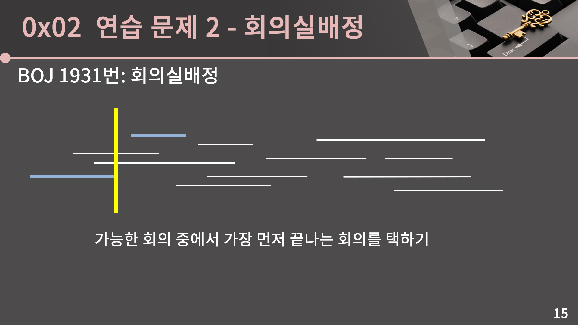 두 번째 문제는 BOJ 1931번: 회의실배정 문제입니다. 이 문제는 보통 제대로 된 알고리즘 수업을 들으면 그리디 파트에서 task scheduling problem이라는 이름으로 꼭 다루는 문제입니다.