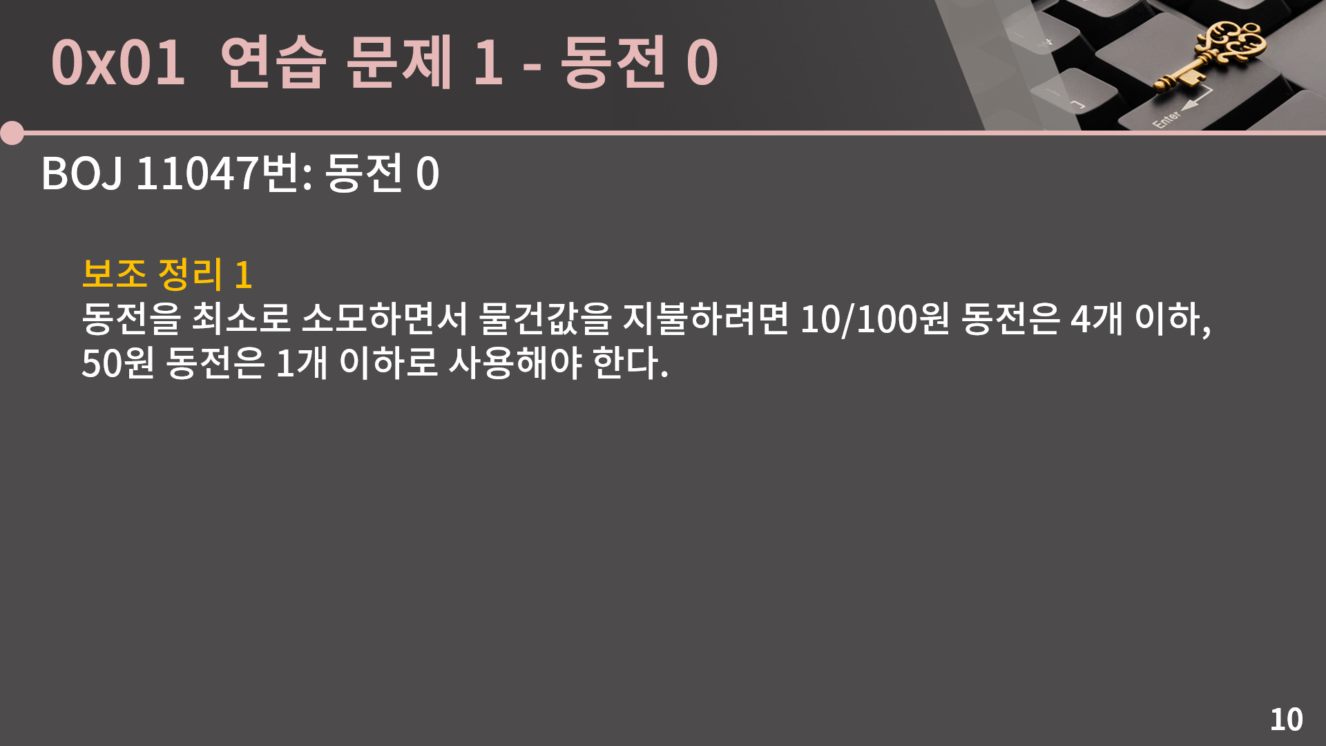 귀류법으로 생각해서 10/100원 동전을 5개 이상 사용하거나 50원 동전을 2개 이상 사용해서 동전을 최소로 소모할 수 있다고 하겠습니다. 그런데 10/100원 동전이 5개 이상이면 이걸 50/500원 동전으로 대체하고, 50원 동전이 2개 이상이면 100원 동전으로 대체했을 때 동전의 개수가 더 줄어듭니다. 그렇기 때문에 모순이 발생해서 보조 정리 1이 참임을 알 수 있습니다.