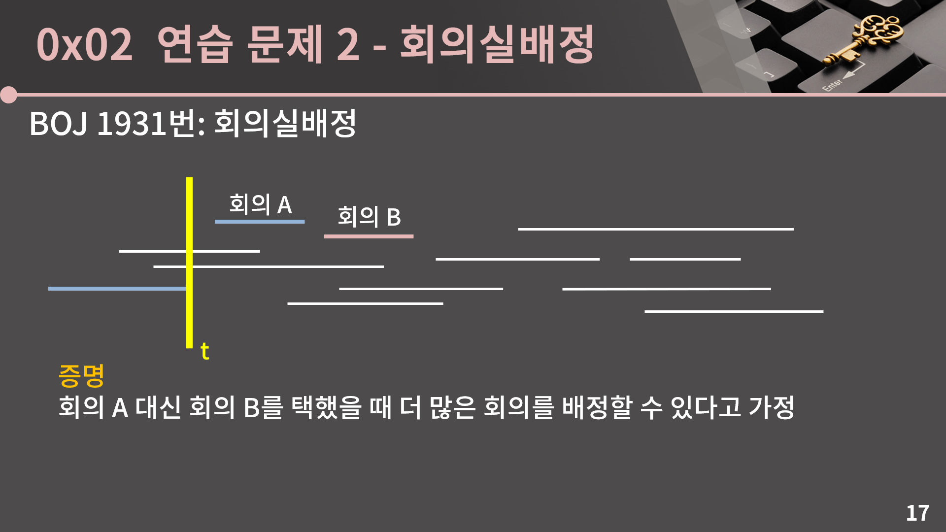 이 증명은 지금 최선의 선택을 하지 않았을 경우 최선의 선택을 했을 때 보다 더 결과가 좋아질 수 없다는 것을 보인거고 나중에 다른 그리디 문제를 풀 때에도 내가 떠올린 그리디 알고리즘이 올바른지 확인할 때 지금 당장 손해를 보더라도 나중 가서는 이득인 경우가 있을 수는 없는지 고민해보면 정당성을 확인하거나 반례를 찾을 때 도움이 됩니다. 알고리즘에 대한 설명은 이정도로 하고 구현에 대해 얘기해보면 이 문제는 방향을 잘못 잡으면 구현이 어려울 수 있습니다. 매 순간 남아 있는 회의 중에서 가장 먼저 끝나는 회의를 찾으려고 하기 보다는 회의를 적절하게 정렬해둔 후에 하나씩 보면서 이 회의를 현재 상황에서 스케쥴에 넣을 수 있는가를 정하는 방향으로 구현을 하면 좋습니다. 특히 이 문제는 직접 구현을 하면서 느낄 수 있는게 많기 때문에 코드를 바로 보기 보다는 구현을 해보면 좋겠습니다.