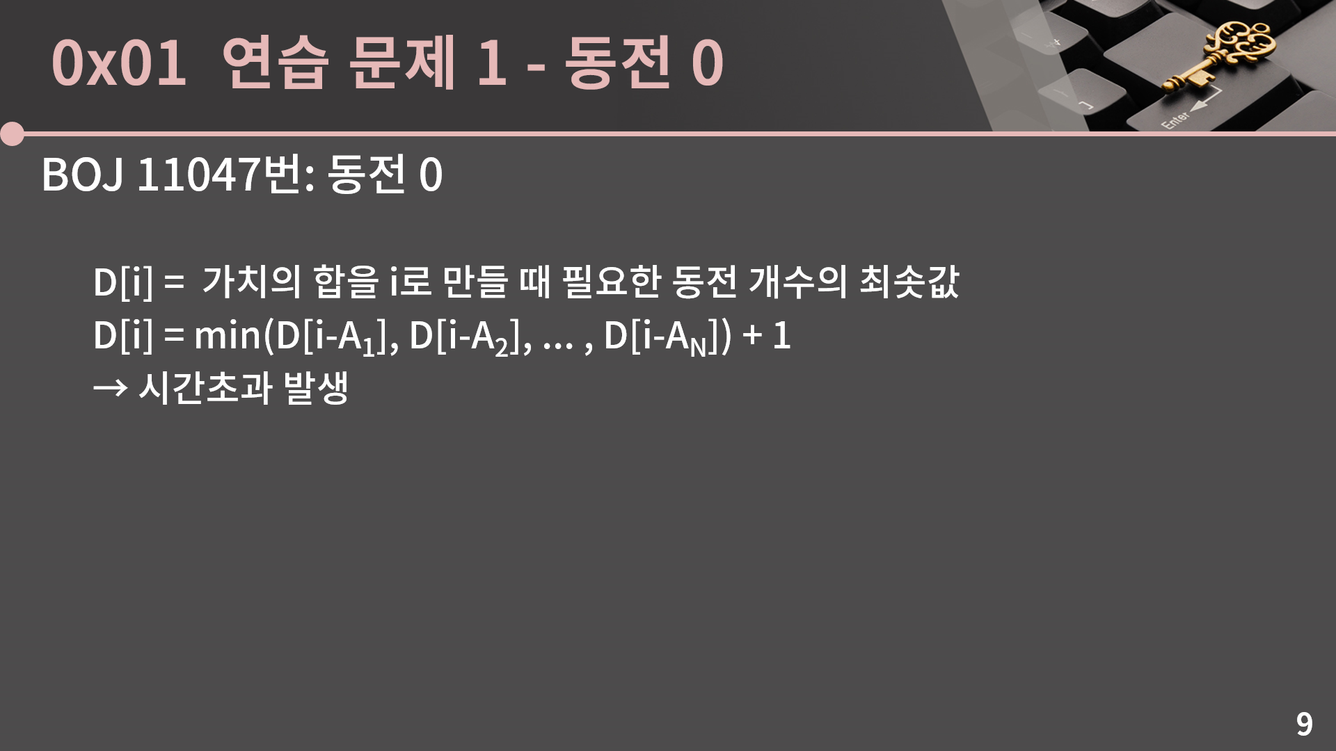결론적으로 말하면 D[i]를 가치의 합을 i로 만들 때 필요한 동전 개수의 최솟값 이라고 정의했을 때 D[i] = min(D[i-A1], D[i-A2], ... D[i-AN]) + 1이 됩니다. 마지막에 사용한 동전이 A1인지, A2인지, ... , AN인지를 가지고 식을 세울 수 있는거고 이렇게 풀이를 하면 O(NK)에 답을 구할 수 있습니다. 그럭저럭 나쁘지 않은 풀이이지만 아쉽게도 이 문제에서는 K가 최대 1억, N이 최대 10이어서 O(NK)는 시간 초과가 발생합니다.