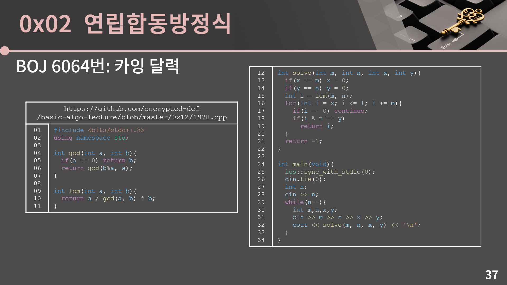 마지막으로 생각해볼 점 3개를 던지고 단원을 마무리하겠습니다. 첫 번째로 1번째 해부터 LCM(M, N)번째 해까지를 봐야하는건 맞는데, 사실 코드에서 l = lcm(m, n)을 계산해서 i <= l을 하는 대신 그냥 i <= m*n 으로 두고 for문을 돌려도 답은 똑같이 잘 나옵니다. 이렇게 하면 굳이 gcd, lcm 함수를 쓸 필요가 없어서 더 편한데 왜 lcm(m, n)을 계산하지 않고 m*n까지로 범위를 잡아도 똑같이 잘 동작하는지 고민을 해봅시다.