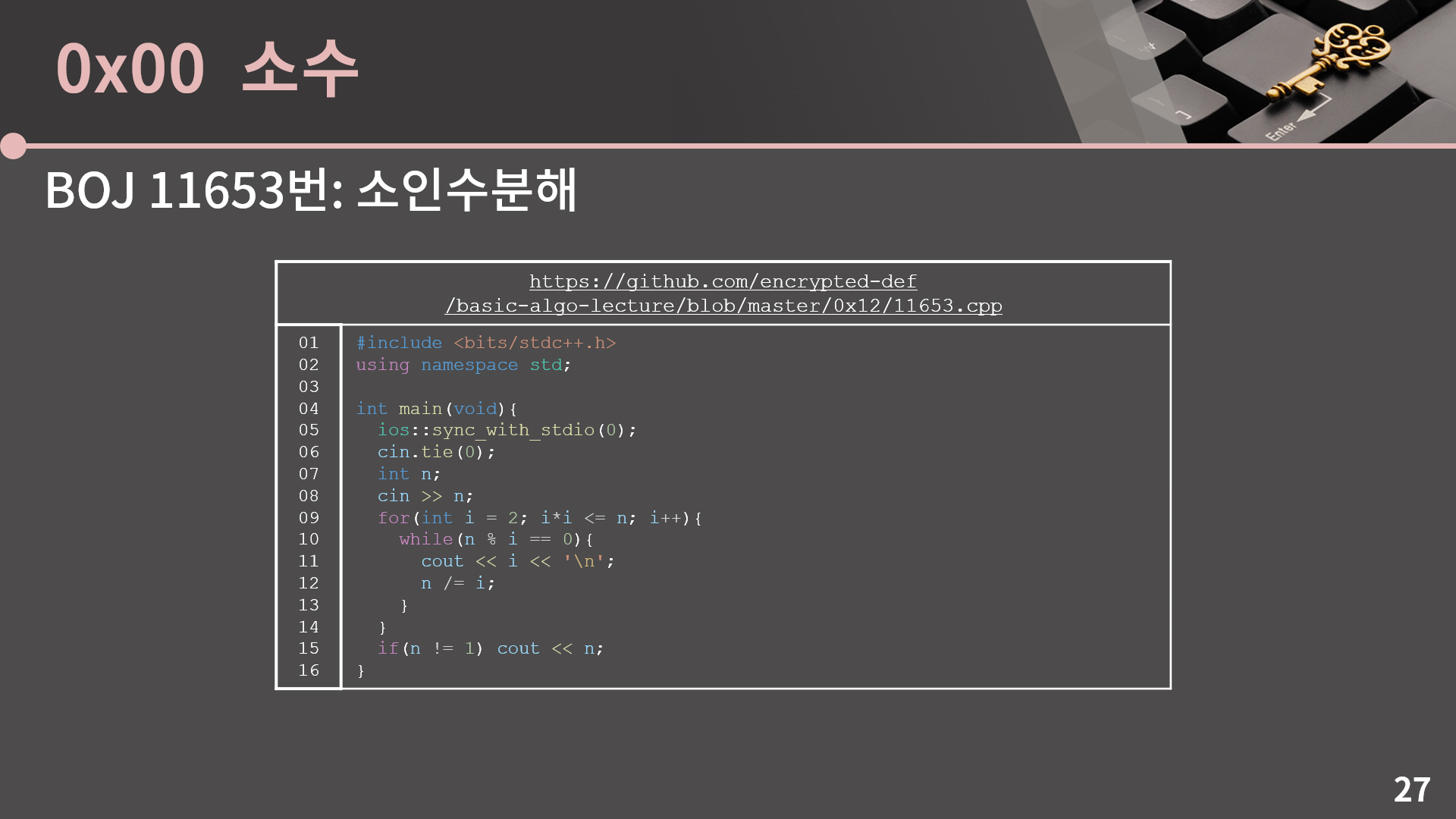 다음 슬라이드에서는 바로 코드를 보여드릴테니 그 전에 직접 구현을 해보도록 합시다. 구현을 한 다음에 BOJ 11653번: 소인수분해 문제에 제출해 올바르게 짰는지 확인해봅시다.