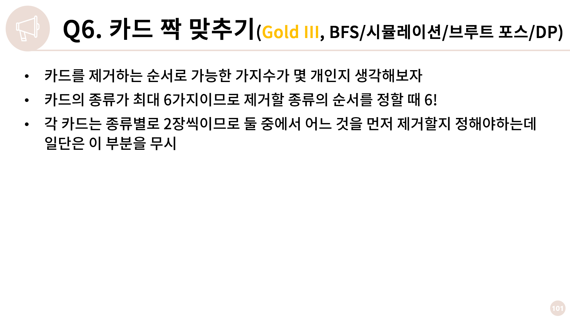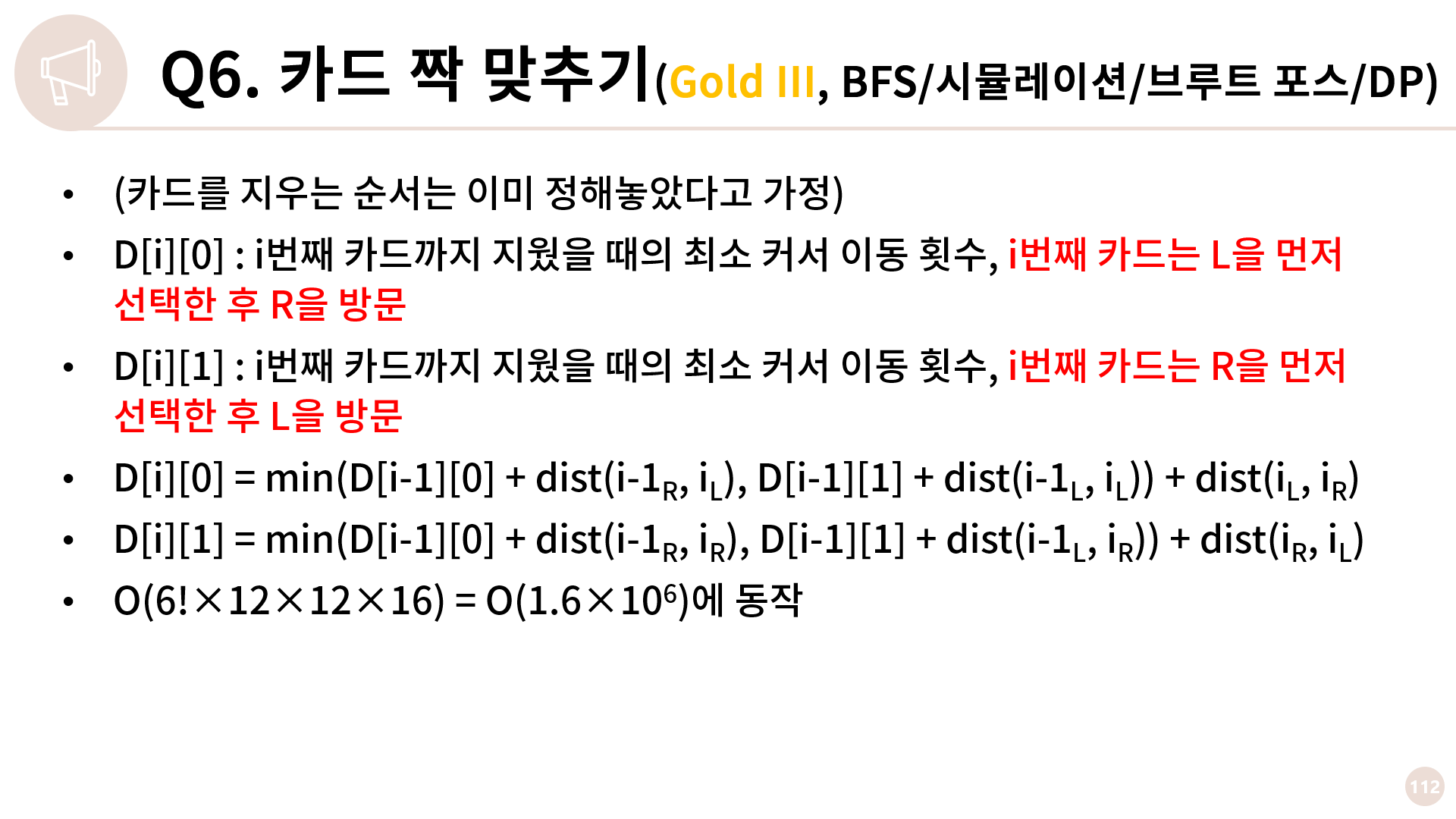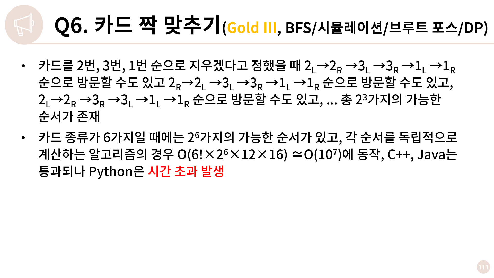 카드 종류는 총 6가지이니 이를 감안해 시간복잡도를 계산해보면 6! * 26개의 가능한 순서가 있고 각 순서에 대해 BFS를 총 12번, 각 BFS는 대충 O(16)이니 대략 O(107) 정도가 됩니다. 이렇게 짜면 C++, Java는 통과되는데 Python에서는 시간 초과가 발생합니다.