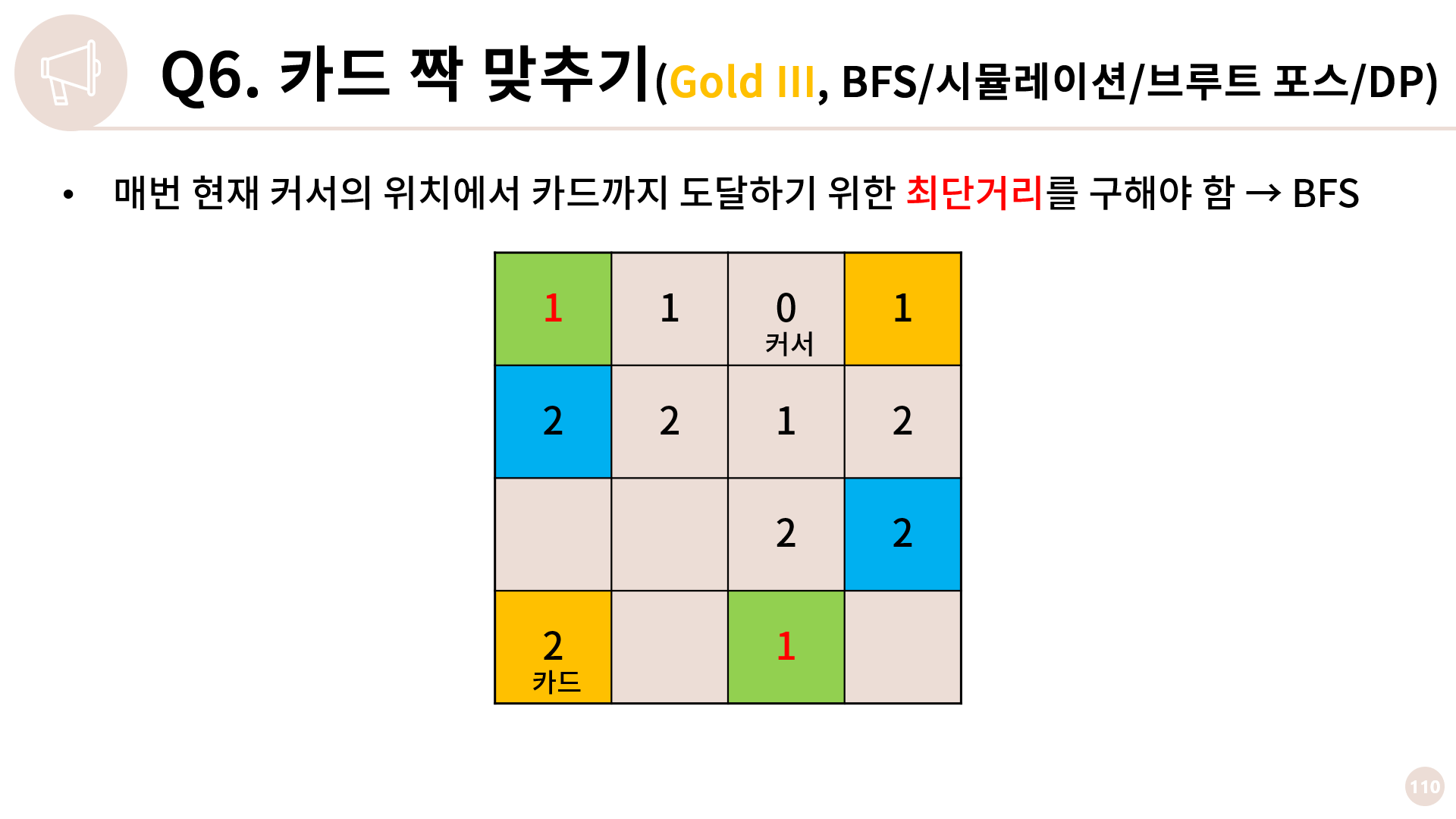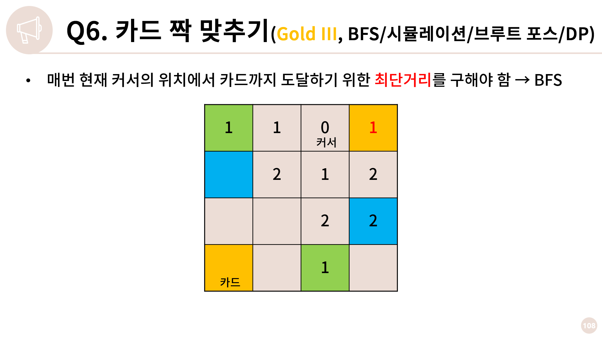 다음으로 매번 현재 커서의 위치에서 카드까지 도달하기 위한 최단거리를 구해야 하는데, 코드 좀 치시는 분들은 2차원 배열에서 가중치가 1인 상황에서의 최단거리다 하면 바로 눈이 돌아가야합니다.