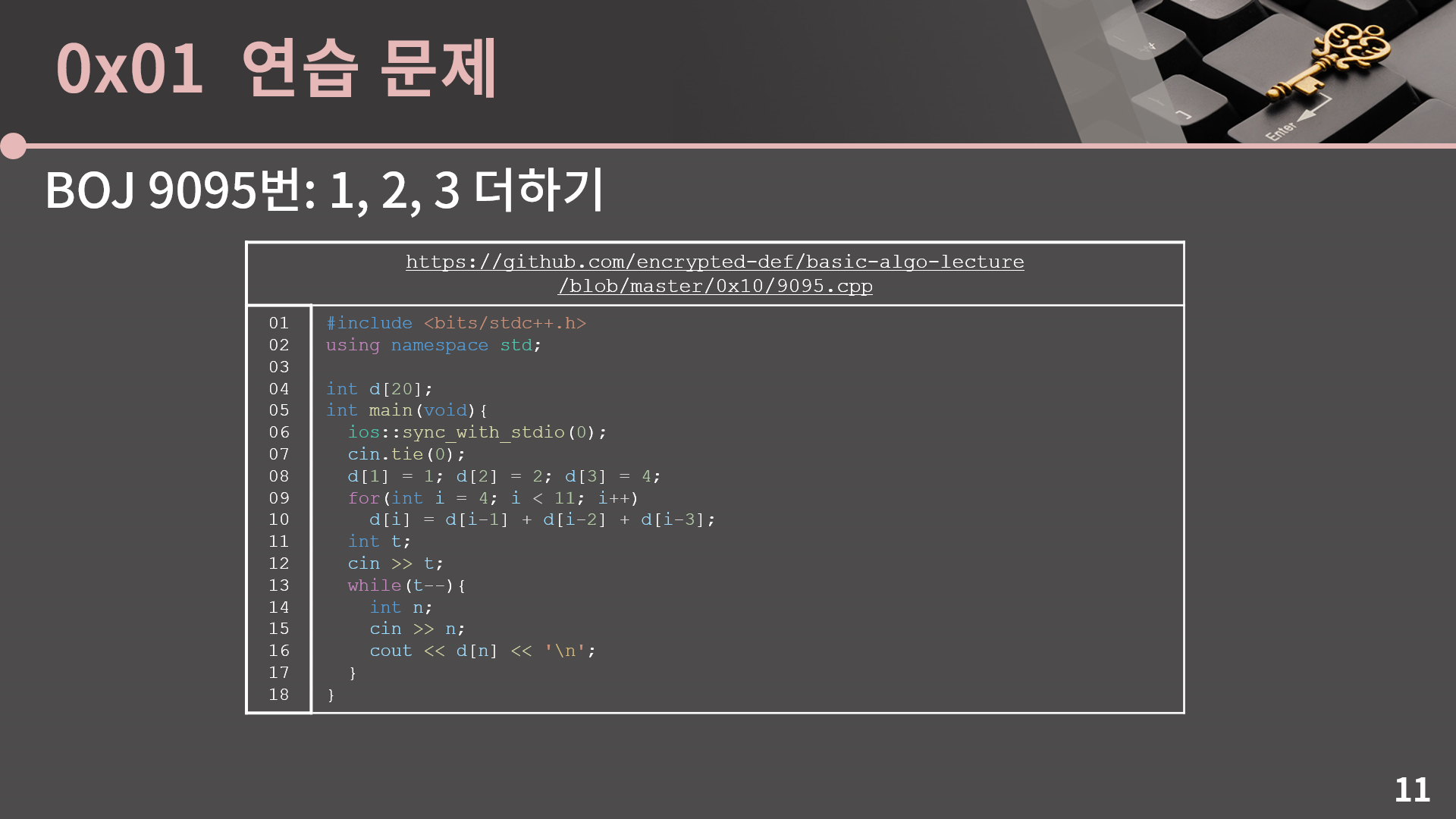 바로 코드를 보여드리면 이렇게 간단하게 짤 수 있습니다. 테이블을 바깥에서 미리 다 계산해둔 후에 매번 n이 들어올 때 마다 d[n]을 바로 출력해줬습니다. 이 문제에서야 워낙 n이 작으니 상관은 없다만 다른 문제를 풀다가 비슷한 상황이 또 있다면 n이 주어질 때 마다 매번 d[1]부터 d[n]까지 새로 구하는 것 보다 미리 다 구해두는게 효율적이란걸 기억합시다.