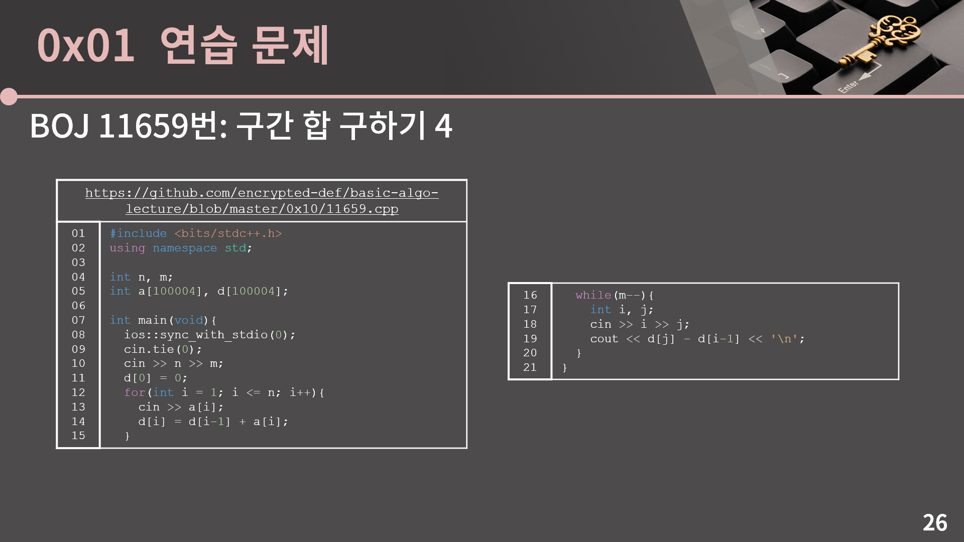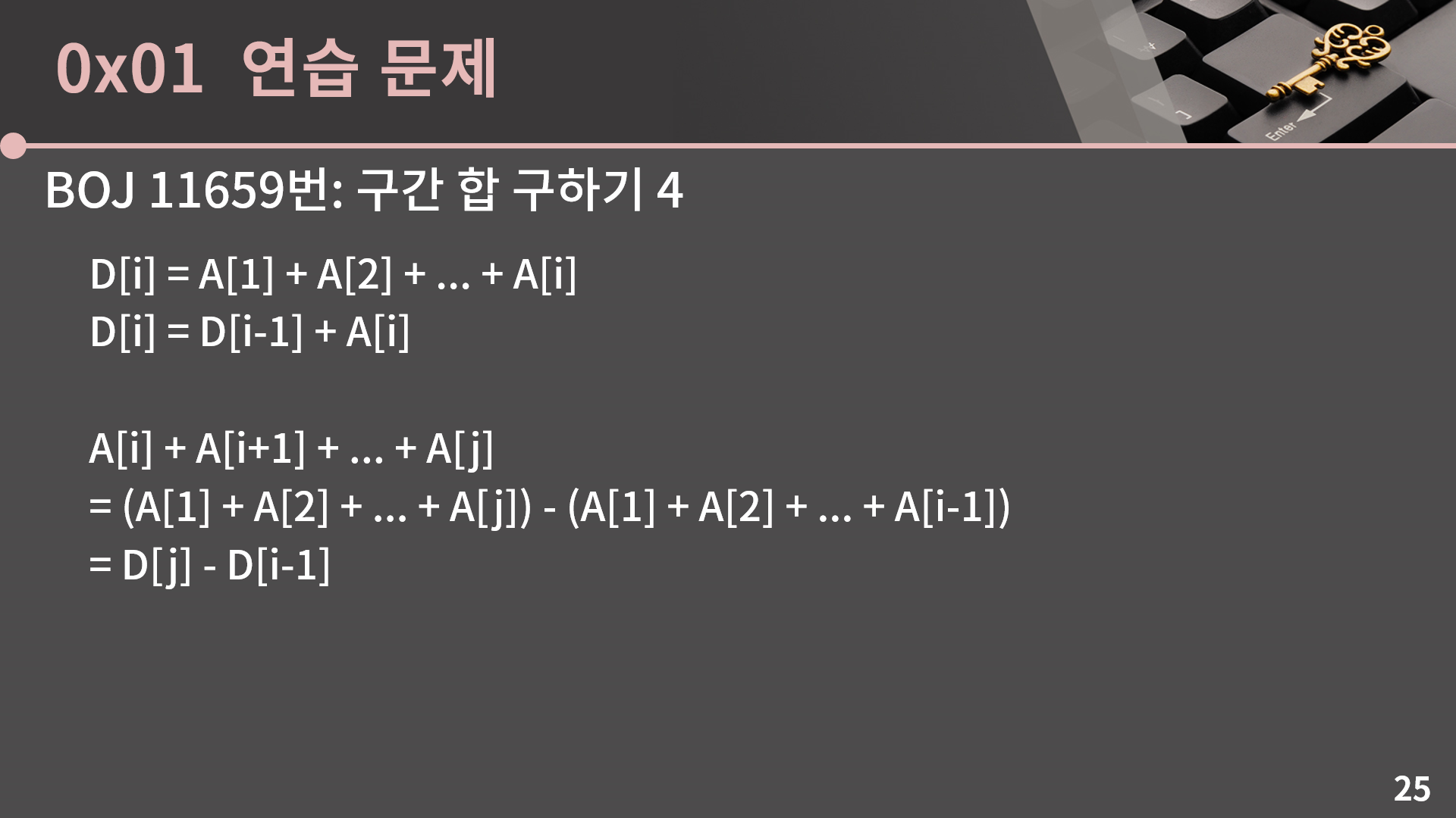 지금 이 문제에서는 대놓고 Prefix sum을 그대로 가져다 쓰면 되는 상황이었지만 Prefix sum을 문제를 푸는 과정에서 시간복잡도를 줄이는 기법 중 하나로 써먹는 경우도 종종 있어서 이 기법을 기억해두시면 좋겠습니다.