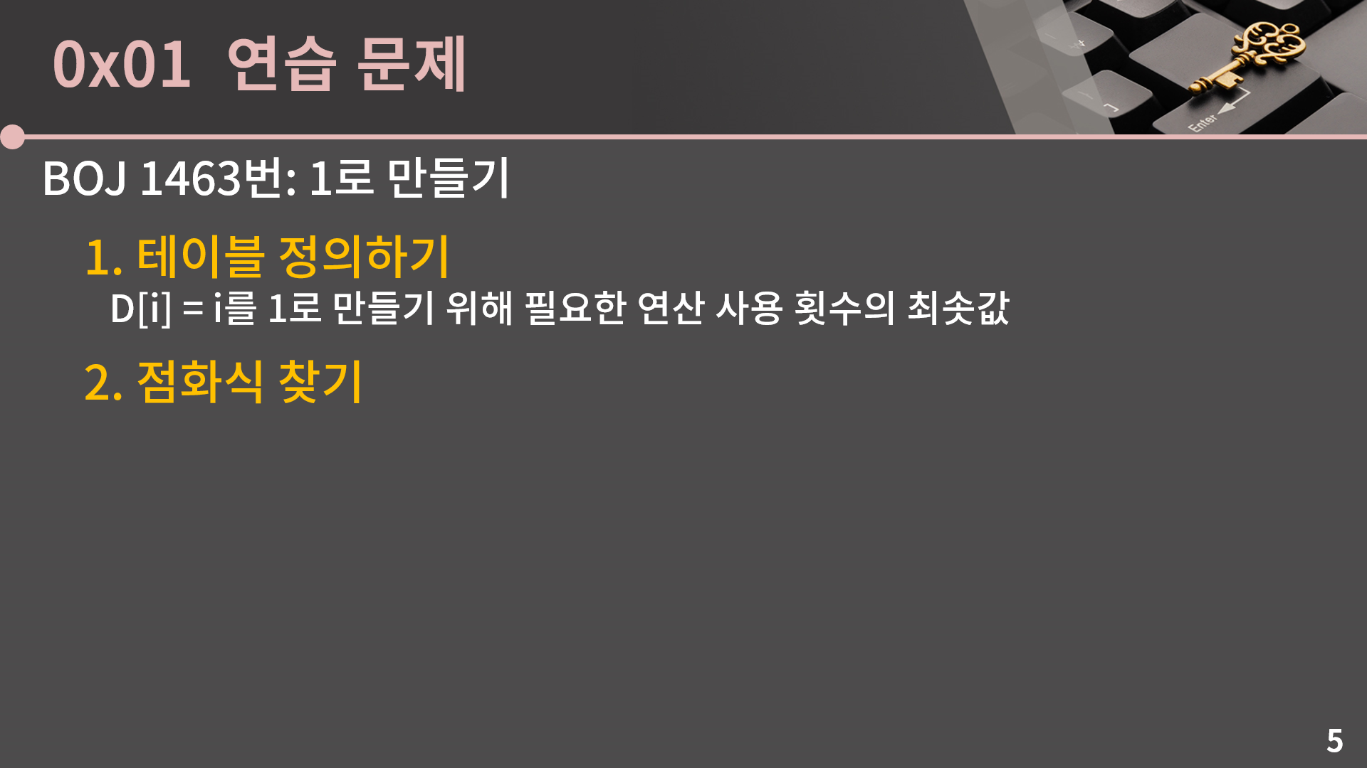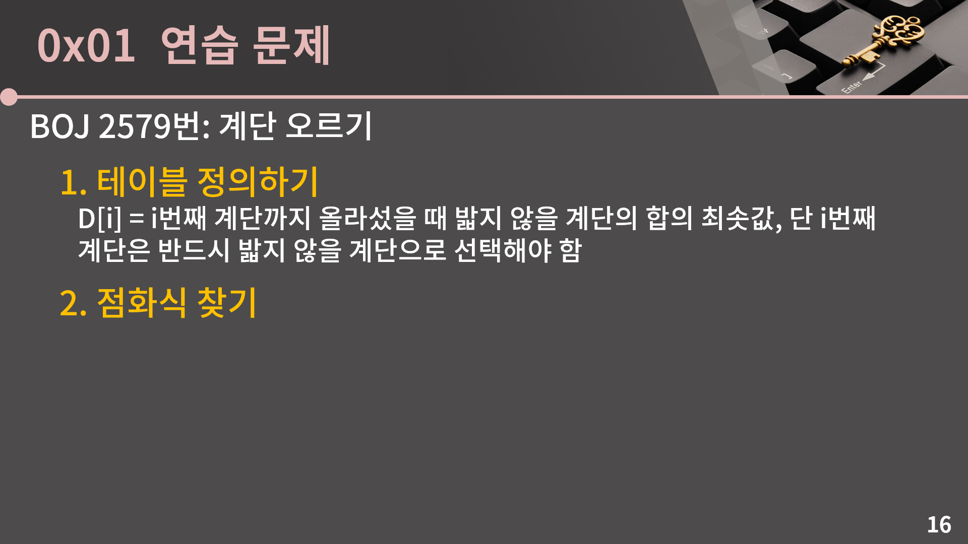 하지만 다양한 DP 문제를 풀어봤거나 뛰어난 수학적 직관력을 가지고 있지 않은 이상 문제에서 점화식을 이끌어내는 과정이 그렇게 쉽지 않고, 무엇보다도 초보 단계에서는 주어진 문제가 DP로 푸는 문제라는 것 자체를 알아차리지 못할 수도 있습니다. 그래서 이번 강의에서는 쉬운 문제를 많이 다뤄서 테이블을 잡고 식을 찾는 연습을 같이 해보려고 합니다. 여러분들도 그룹 내의 문제집에 올려둔 적당한 난이도의 DP 문제들을 많이 풀고 식을 머릿속으로 고민하면서 많은 유형을 학습하고 숙달하는게 중요합니다. 그래야 코딩테스트에서 DP 문제가 나왔을 때 빠르게 쓱싹할 수 있습니다.