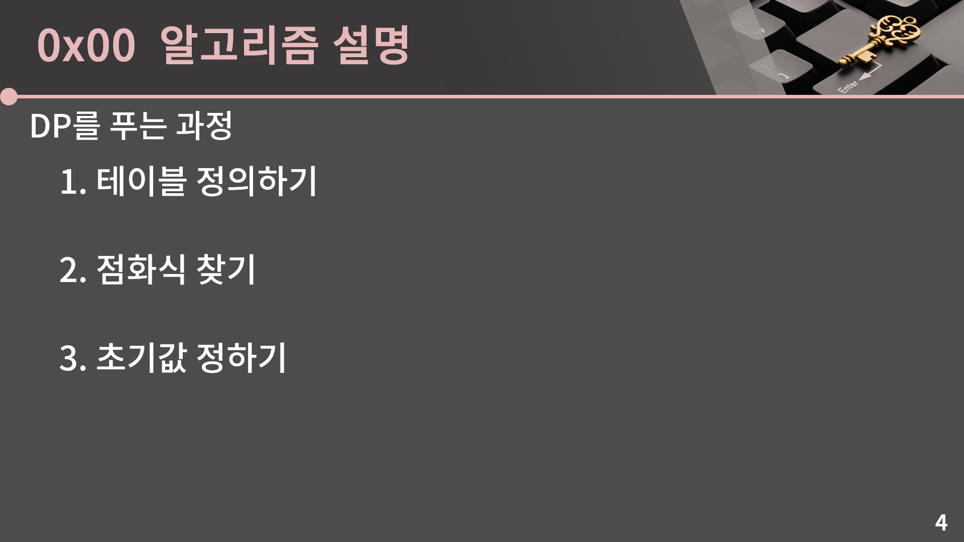 제일 먼저 테이블을 정의해보면 앞 문제에서의 상황을 생각했을 때 딱 떠오르는 형태가 있습니다. 바로 D[i] = i를 1, 2, 3의 합으로 나타내는 방법의 수라고 정의하는 방법입니다. 이걸 바탕으로 점화식을 만들어야 할텐데 어떻게 예쁜 점화식을 만들 수 있을지 같이 고민해보겠습니다. 바로 점화식을 보여드려도 되지만 같이 생각하는 시간을 가져본다는 차원에서 D[4]를 같이 구해보겠습니다.