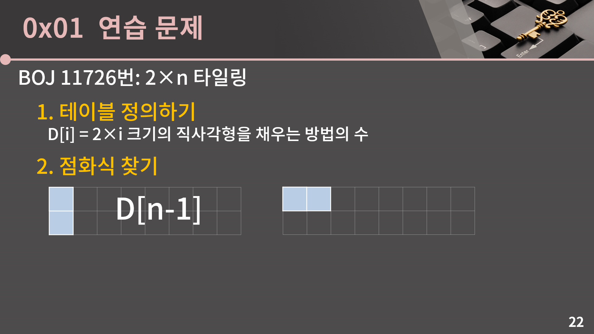 결과적으로 남은건 2×(n-2)칸이기 때문에 채우는 방법의 수는 D[n-2]입니다. 그러면 2×n칸을 채울 때 왼쪽 위의 칸을 2×1 타일로 덮으면 D[n-1]가지가 있고 1×2 타일로 덮으면 D[n-2]가지가 있으니 D[n] = D[n-1] + D[n-2]입니다. 뭔가 처음 봤을 땐 DP랑 크게 관련이 없어보이는 문제였는데 알고 봤더니 DP였습니다.
