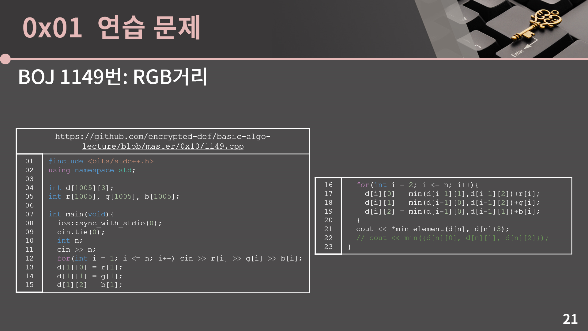 코드는 이렇게 생겼습니다. d[n][0], d[n][1], d[n][2] 중 최소를 출력하면 되는데 그걸 21번째 줄처럼 해도 되고 22번째 줄처럼 해도 됩니다.(코드 링크)