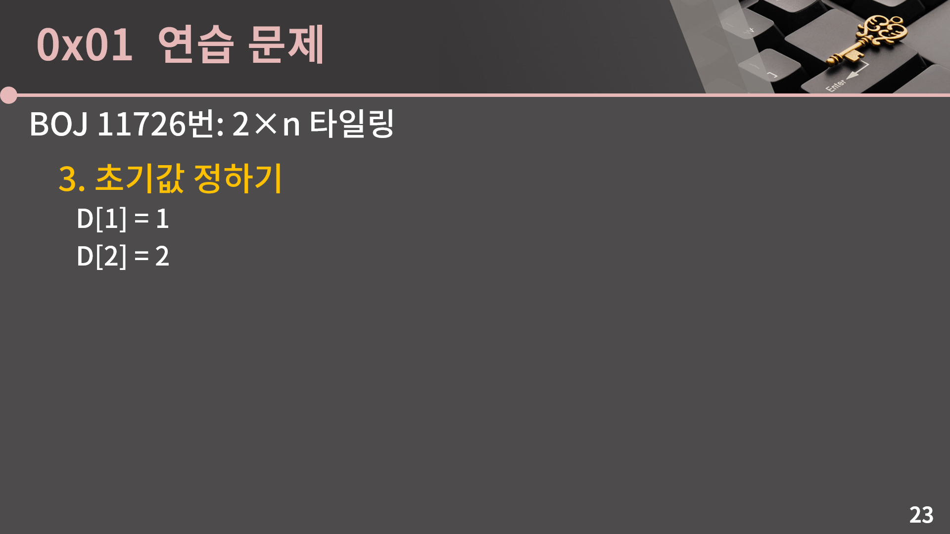 초기값을 어디까지로 할까 고민해보면 D[n]을 구할 때 D[n-2]까지가 필요하니 D[1]과 D[2]를 초기값으로 두는게 바람직합니다. 저 초기값과 식에서 알 수 있듯 이 값은 사실 피보나치 수열이 됩니다.