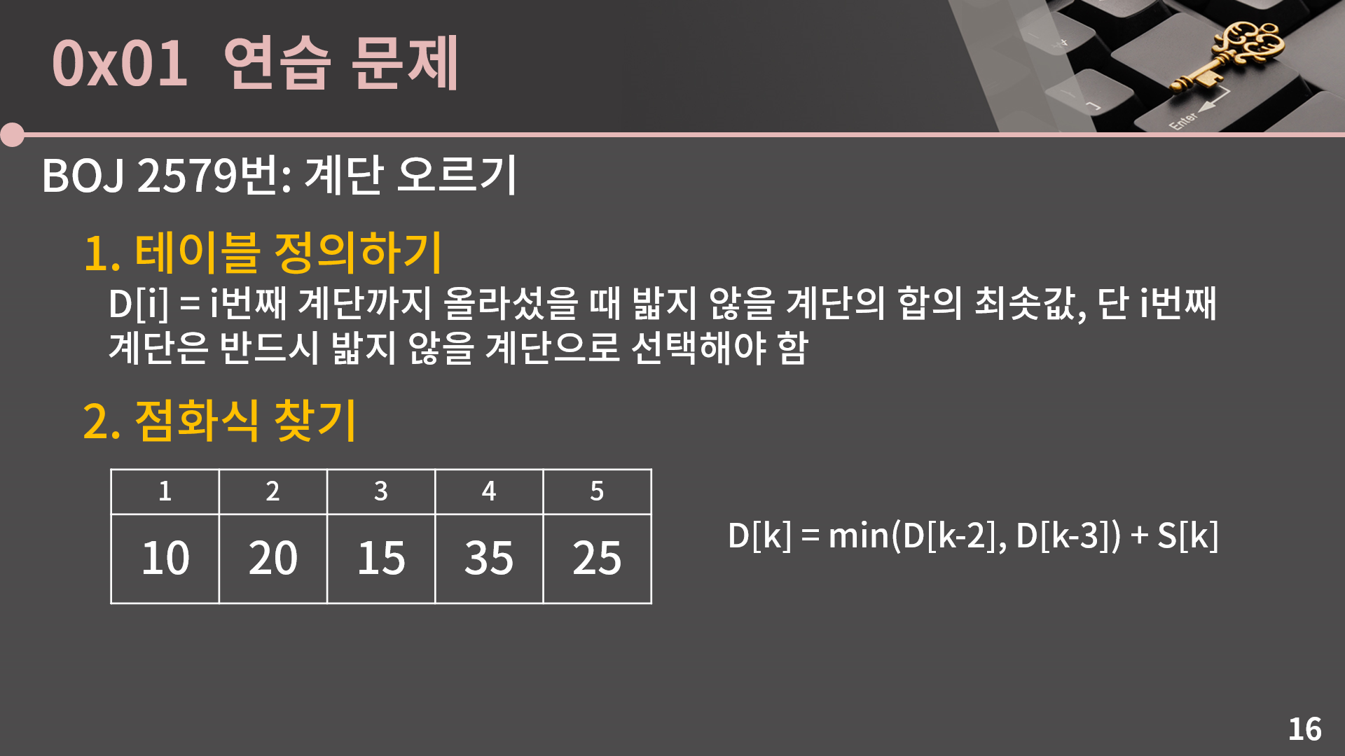 이렇게 테이블을 직접 채우다보면 좀 감이 오기 마련인데, 이제 D[k]로 얘기를 해보면 k번째 계단을 밟지 않을거면 k-2번째나 k-3번째 계단 중 하나를 안밟아야 합니다. 그렇기 때문에 D[k-2] 혹은 D[k-3] 중에 작은걸 가져오면 됩니다. 그래서 D[k] = min(D[k-2], D[k-3]) + S[k]가 됩니다.