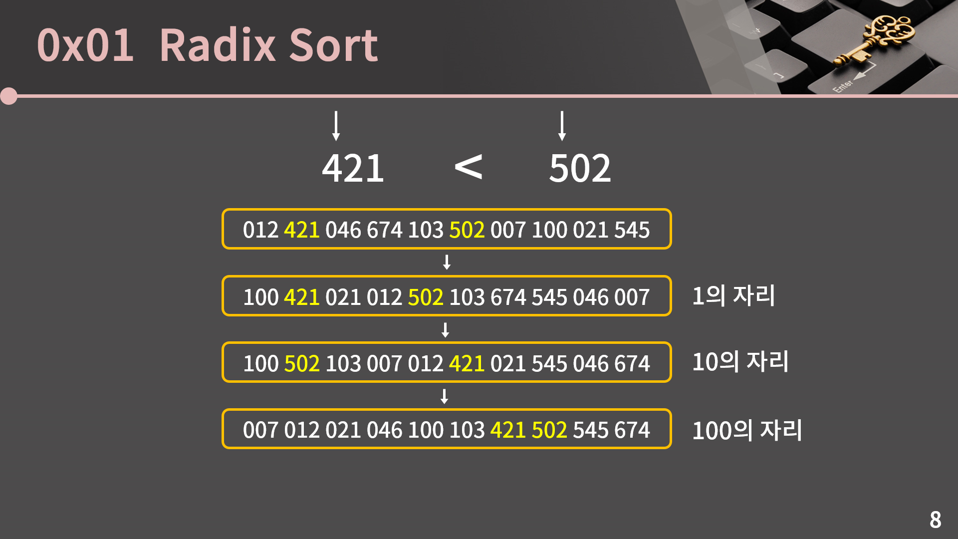 다른 수들은 신경쓰지말고 421과 502에 주목을 해보면 정렬이 잘 되었다면 정렬이 끝났을 때 421이 502 앞에 위치해야 합니다. 그리고 비록 10의 자리까지는 502가 421에 앞에 위치했지만 그 전까지 둘의 위치가 어디에 있는지와 전혀 무관하게 100의 자리에 대해 재배열을 할 때 421은 4번 리스트에 들어가는 반면 502는 5번 리스트에 들어가기 때문에 재배열을 끝낸 후 421이 502보다 앞에 올 수 밖에 없다는걸 알 수 있습니다.