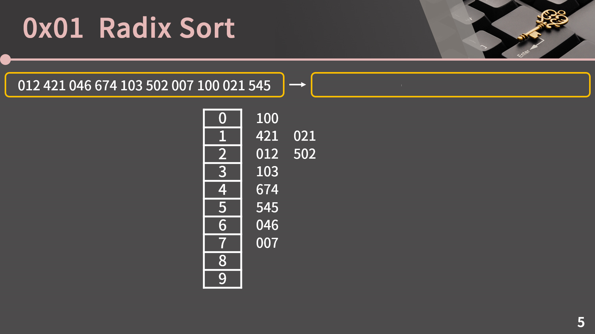 즉 처음에 012는 1의 자리가 2이니까 2번 리스트에 넣고, 421은 1의 자리가 1이니까 1번 리스트에 넣고, 이렇게 차례대로 수를 넣어줍니다.