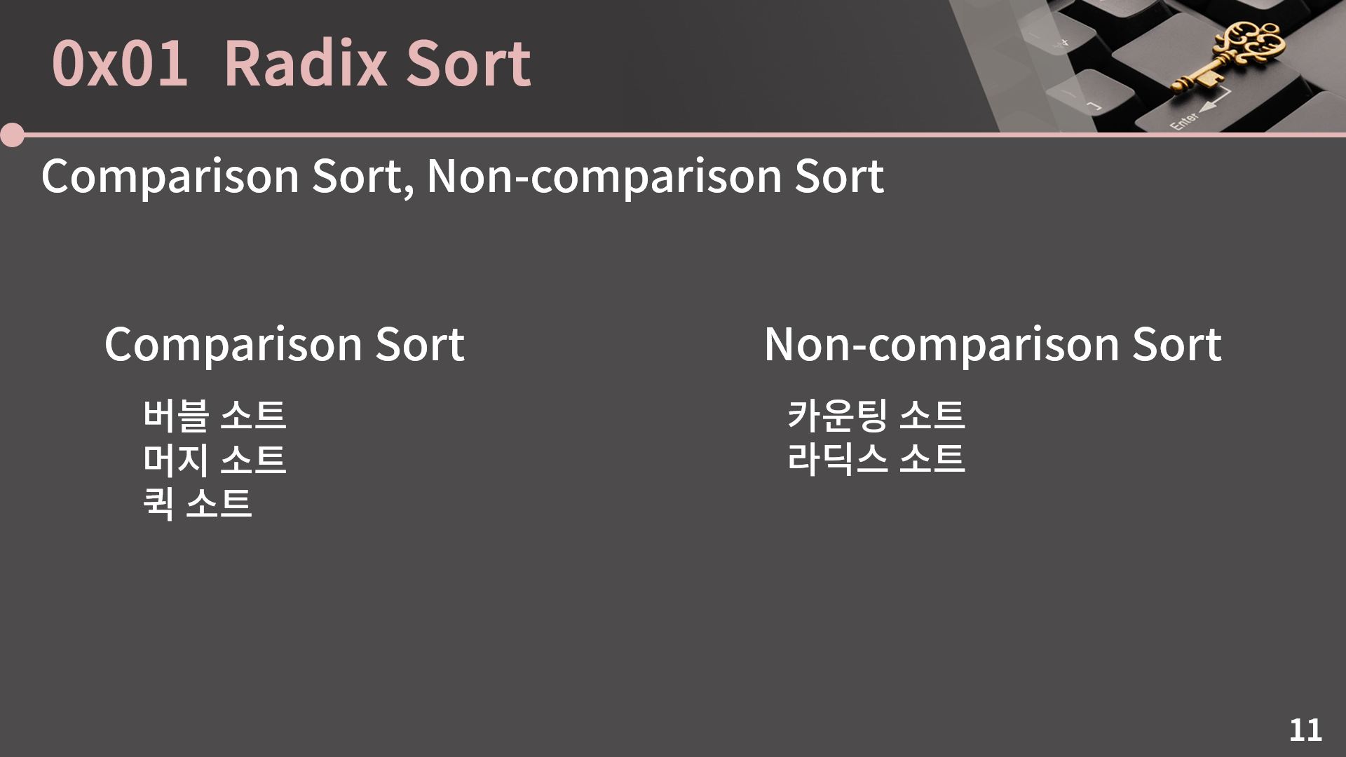 안녕하세요, 정렬 두 번째 시간입니다. 첫 시간에는 머지 소트와 퀵 소트를 배웠고 이번에는 카운팅 소트랑 라딕스 소트를 배울 예정입니다. 아마 전 시간보다는 더 쉬울거라 걱정을 조금 덜어내시고 들으면 될 것 같습니다.