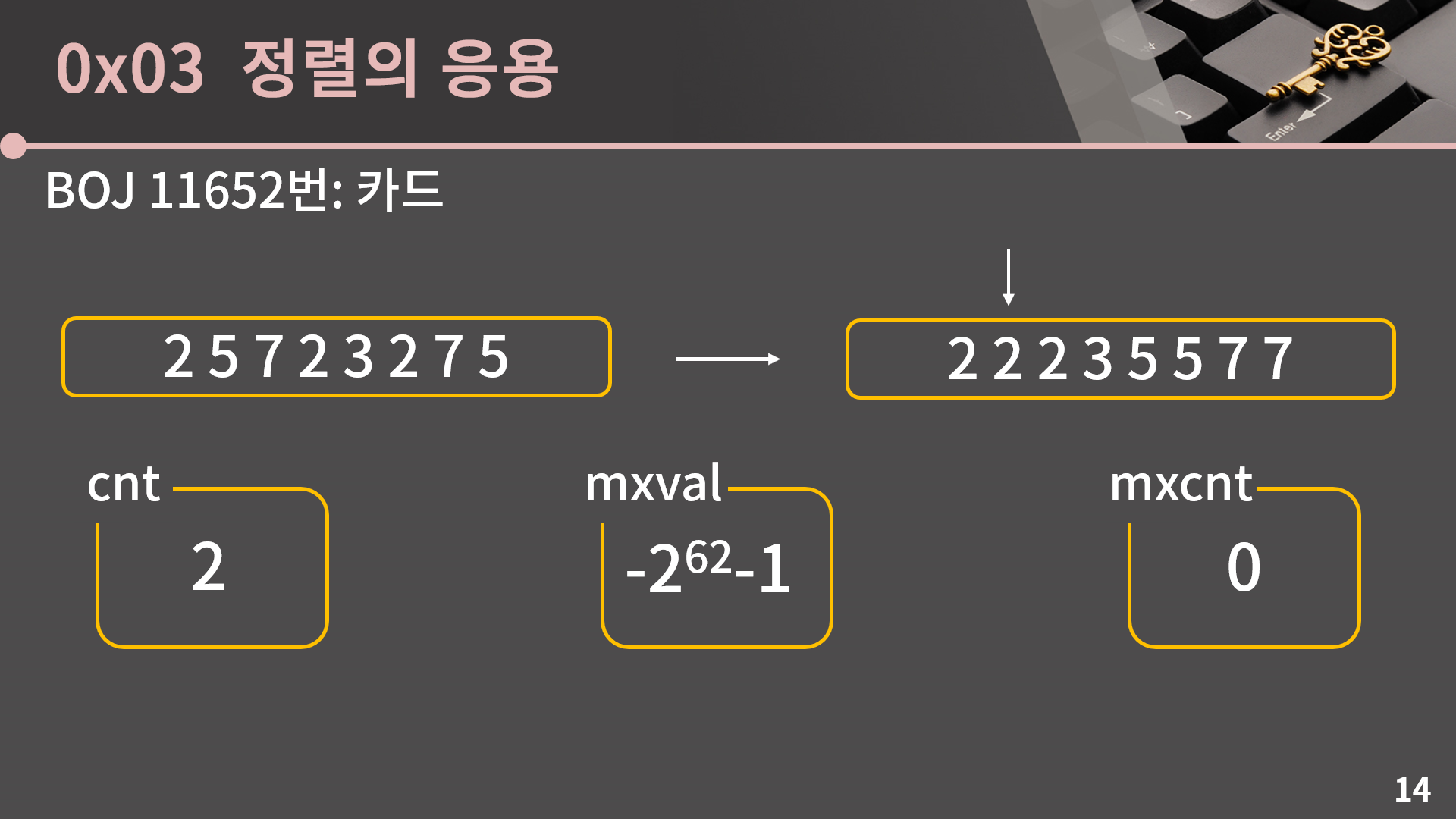정렬에 대해 다룰건 다 다뤘고 마지막으로 정렬을 써먹을 수 있는 문제를 소개하겠습니다. 단순히 답을 오름차순으로 출력하라는 것과 같이 직관적으로 정렬이 필요함을 알 수 있는 문제 말고 정렬을 이용해서 시간복잡도를 개선할 수 있는 문제를 같이 보겠습니다. BOJ 11652번: 카드 문제를 확인해주세요.