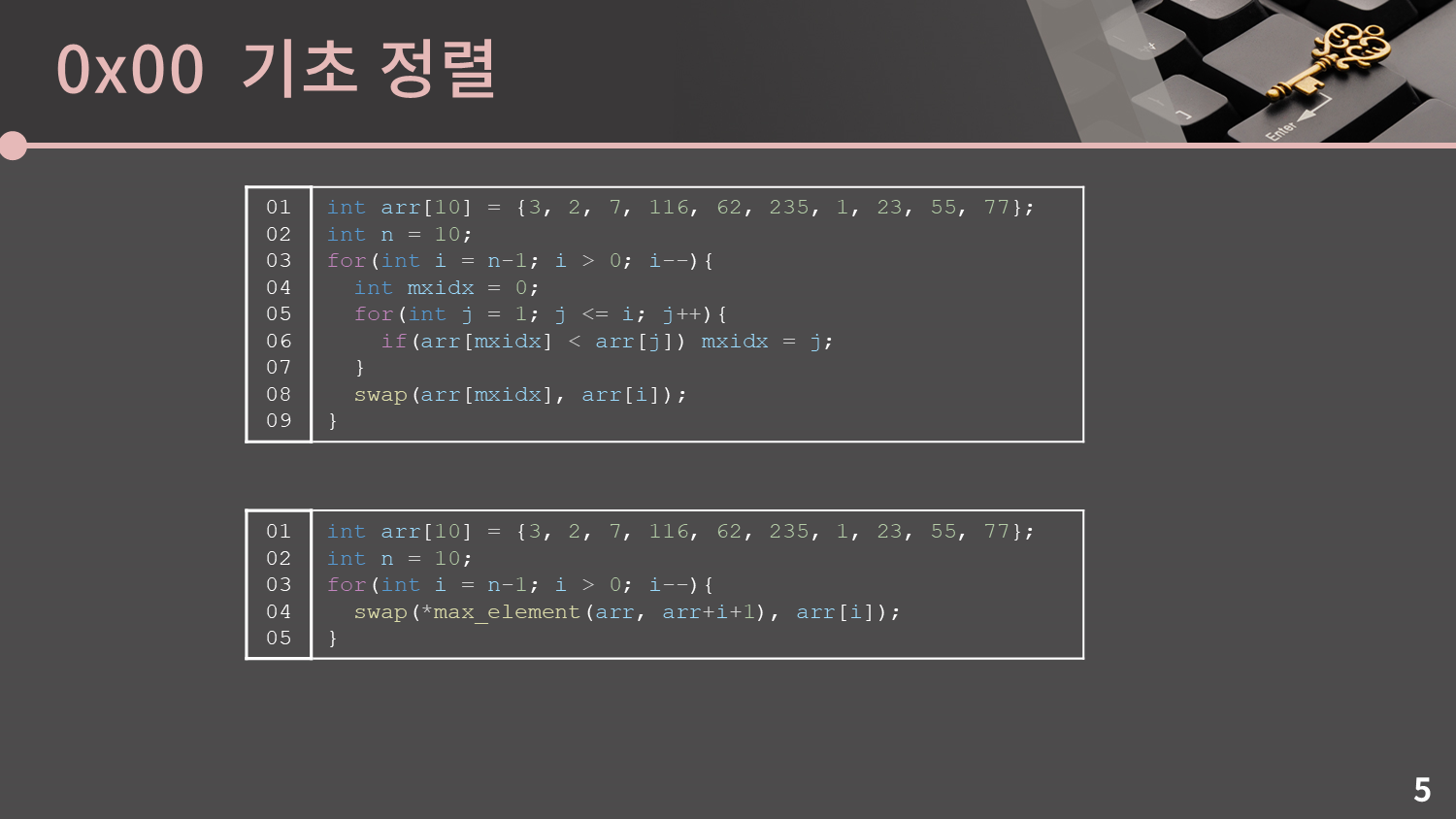 앞에서 본 방법을 실제 배열에 대해 적용해보겠습니다. 앞과 비슷하게 제일 끝부터 가장 큰 원소가 오게끔 하면 되고 0부터 i까지의 수 중에 가장 큰 것의 인덱스를 mxidx에 담은 후 arr[mxidx]와 arr[i]를 swap해서 해결했습니다. 그리고 이걸 STL을 이용해 드라마틱하게 코드의 길이를 줄일 수 있는데 이렇게 max_element 함수를 이용하면 됩니다.