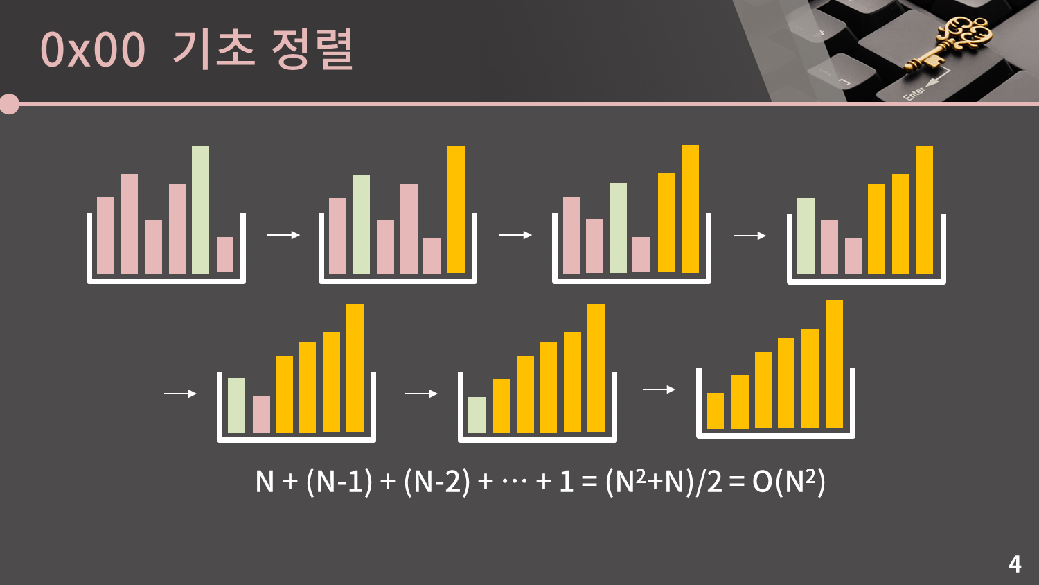 앞에서 소개한 선택 정렬이나 지금 본 버블 정렬은 모두 O(N2)의 시간복잡도가 필요합니다. 이외에도 삽입 정렬이란게 존재하고 삽입, 선택, 버블 정렬 이 3개가 O(N2)에 동작하는 대표적인 정렬 방법이입니다. 그런데 앞으로 면접에서 이 3개를 구분하는걸 물어볼 일이 절대 없다고 장담할 수는 없지만 한 99.9999%로는 확신합니다. 저도 이 3개 각각이 정확히 어떤 알고리즘인지는 이번 강의를 만들면서 알았지 그 전에는 구태여 알려고 한 적이 없었습니다. 그러니 삽입, 선택, 버블 정렬 같은걸 외운다고 시간낭비할 필요는 없습니다. 다만 버블 정렬 정도는 구현할 수 있어야 할 것 같은데 그건 다들 자신 있으리라고 믿습니다. 아무튼 저희는 정렬을 O(N2)에 수행할 수 있지만 N이 커지면 O(N2)이 아무래도 좀 별로입니다. 그래서 정렬을 더 빠르게 수행할 수 있는 알고리즘들을 알아보겠습니다.