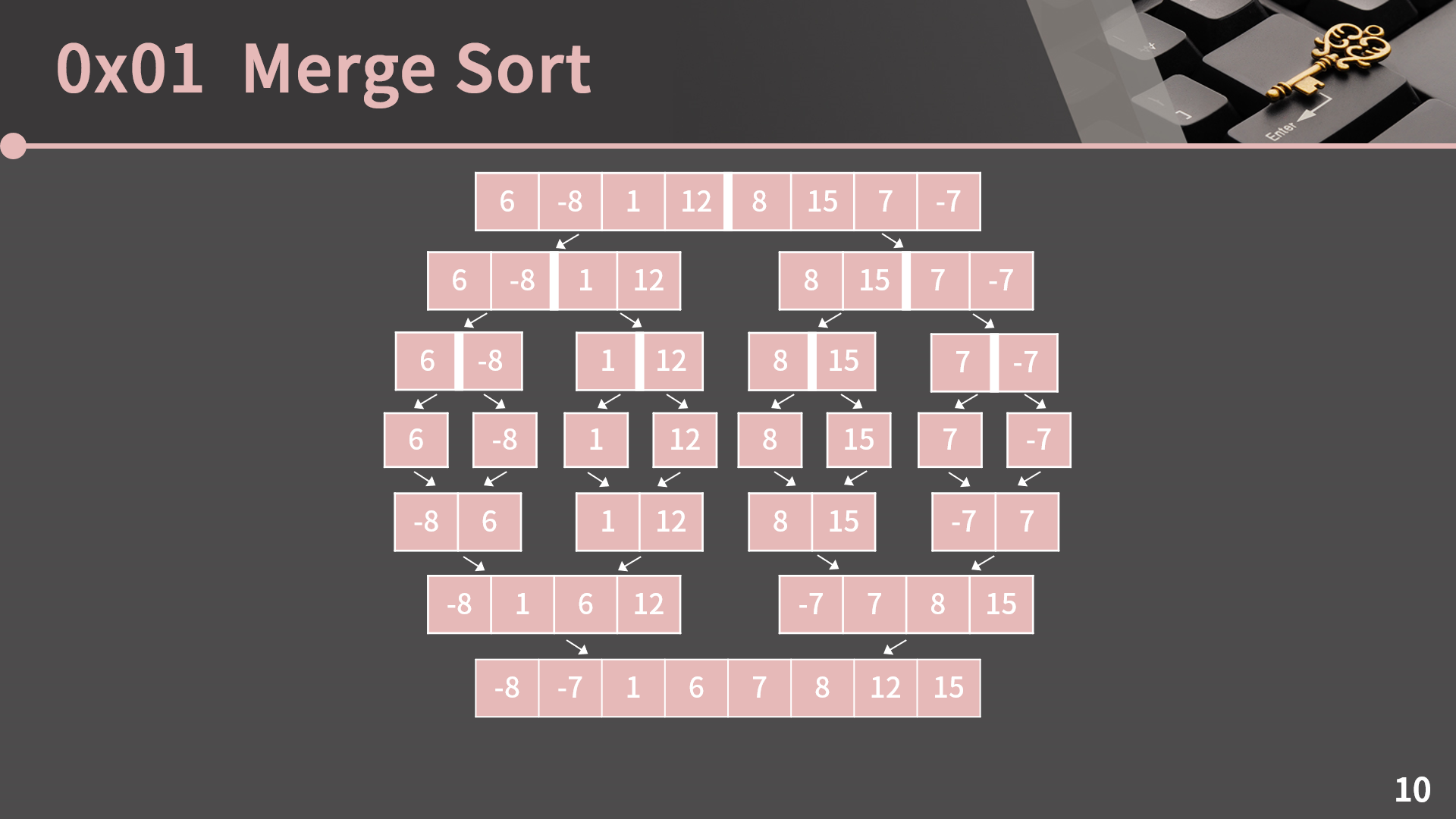 머지 소트는 3단계로 요약이 가능한데 1번, 주어진 리스트를 2개로 나눈다. 2번, 나눈 리스트 2개를 정렬한다. 3번, 정렬된 두 리스트를 합친다. 이게 끝입니다. 여기서 예상되는 질문 1가지는 "아니 그러면 나눈 리스트 2개는 어떤식으로 정렬하는거야?" 라는건데 그렇죠? {6, -8, 1, 12}를 {-8, 1, 6, 12}로 어떻게 정렬하는걸까요? 이걸 이해하려면 다시 재귀로 가야합니다.