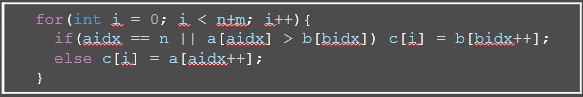 지금 14번째 줄부터 19번째 줄의 코드를 이렇게 바꾸면 어떤 문제가 있을지 고민해봅시다. 사실 대놓고 예제부터 잘못 나와서 이렇게 제출을 시도할 일은 없겠지만 딱 봤을땐 뭐가 잘못됐는지 잘 안보일 것 같습니다. aidx가 n이거나 a[aidx] > b[bidx]일 때 b의 가장 앞 원소를 c로 보내면 되는게 맞을텐데 코드가 뭐가 잘못된걸까요? 뭐가 잘못된거냐면 bidx == m인 경우를 고려하지 않았습니다.. aidx == n인지만 확인했기 때문에 b[m]이라는 잘못된 원소에 접근을 해서 이상한 값을 읽어와 런타임 에러가 나거나 이상한 값이 c에 기록될 수 있습니다.
