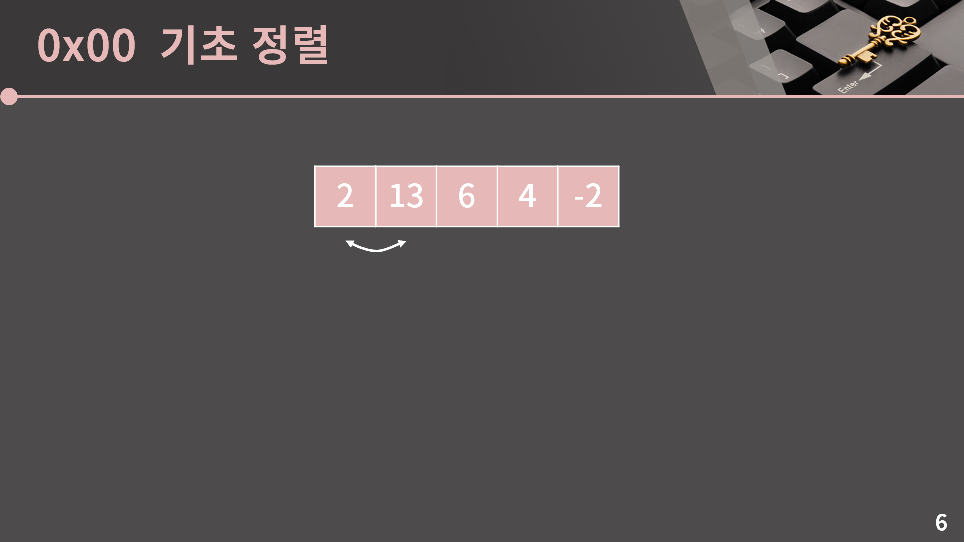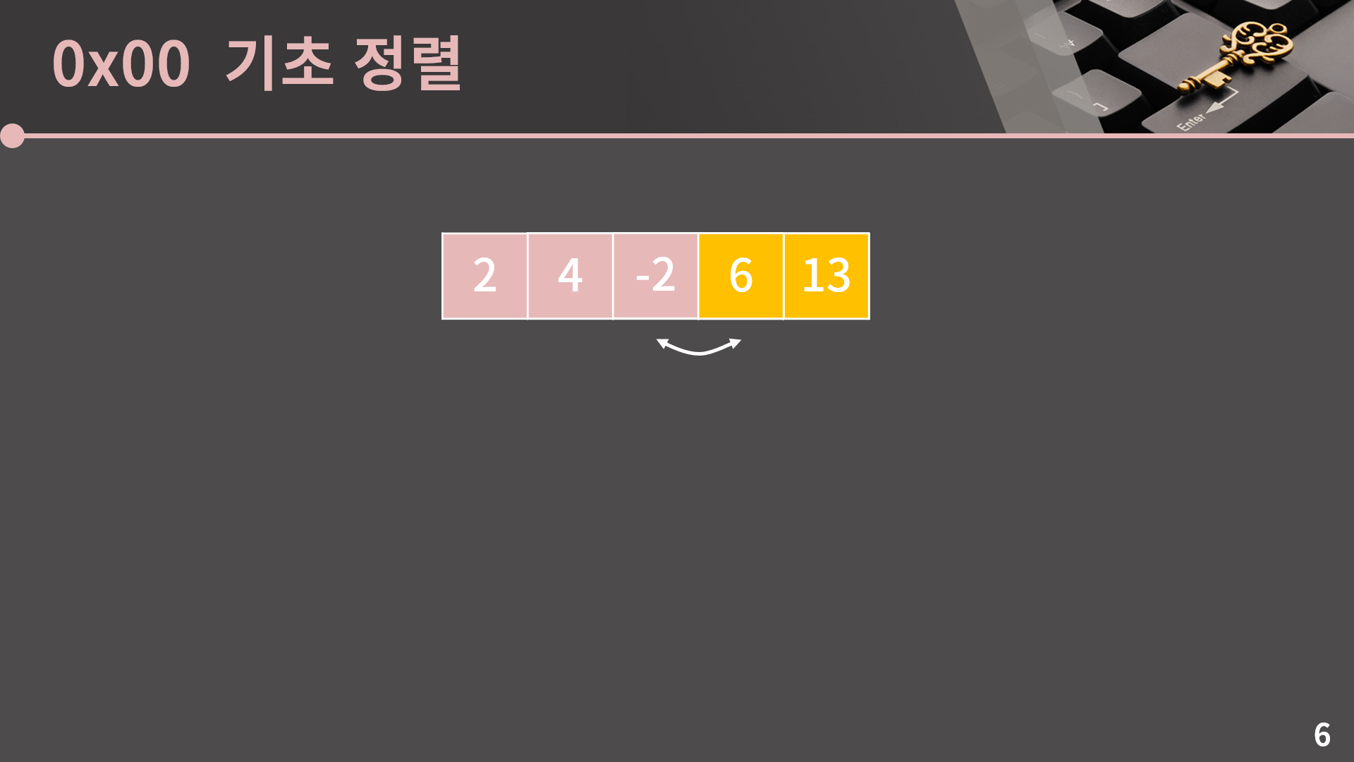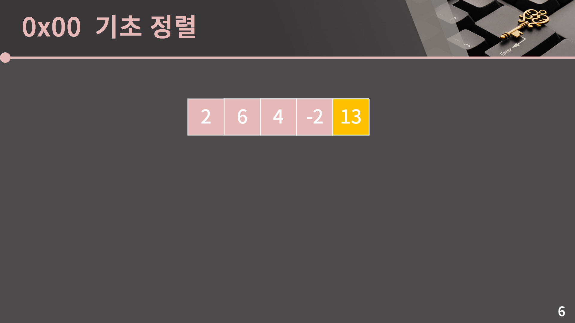 다음은 13과 6이고 13이 6보다 크니 둘의 자리를 바꿉니다.