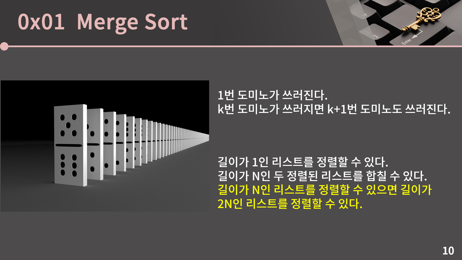 "나는 일단 1번 도미노를 쓰러트릴거다. 그리고 k번 도미노가 쓰러지면 k+1번 도미노도 쓰러진다. 그렇기 때문에 100번 도미노도 쓰러진다." 이렇게 설명을 했을 때 누군가는 손을 들고 질문을 하겠죠. "100번 도미노가 쓰러지려면 99번 도미노가 쓰러져야 하는데 99번 도미노가 쓰러진다는걸 어떻게 보일건가요?" 이 질문에 대한 대답을 알아낸 사람은 {6, -8, 1, 12}를 {-8, 1, 6, 12}로 어떻게 정렬하냐는 질문도 대답할 수 있습니다.