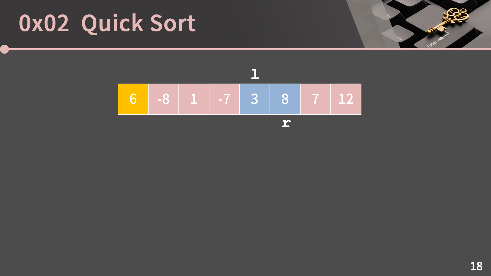 실제로 상황을 보면서 얘기해봅시다. 먼저 l을 pivot보다 큰 값이 나올 때 까지 오른쪽으로 이동하면 12에서 멈춥니다. 그 다음으로 r을 pivot보다 작거나 같은 값이 나올 때 까지 왼쪽으로 이동시킬텐데 애초에 지금 -7이 pivot보다 작으니 이동할 필요 없이 가만히 있으면 됩니다.