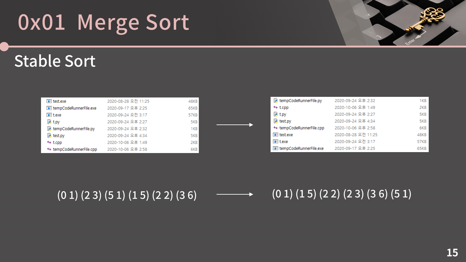 이 Stable Sort를 응용할 수 있는 몇 가지 상황들이 있는데, 첫 번째로 파일들을 정렬하는 상황을 생각해보겠습니다. 첫 번째로 파일들이 이렇게 미리 시간의 오름차순으로 나열되어 있을 때 파일을 크기 순으로, 크기가 동일하다면 빨리 생성된 순으로 정렬하고 싶다고 해봅시다. 이 때 머지 소트가 Stable Sort라는걸 기억하고 있다면 시간을 신경쓰지 말고 그냥 파일의 크기를 기준 삼아서 머지 소트를 수행해서 파일을 크기 순으로, 크기가 동일하다면 빨리 생성된 순으로 정렬할 수 있습니다.