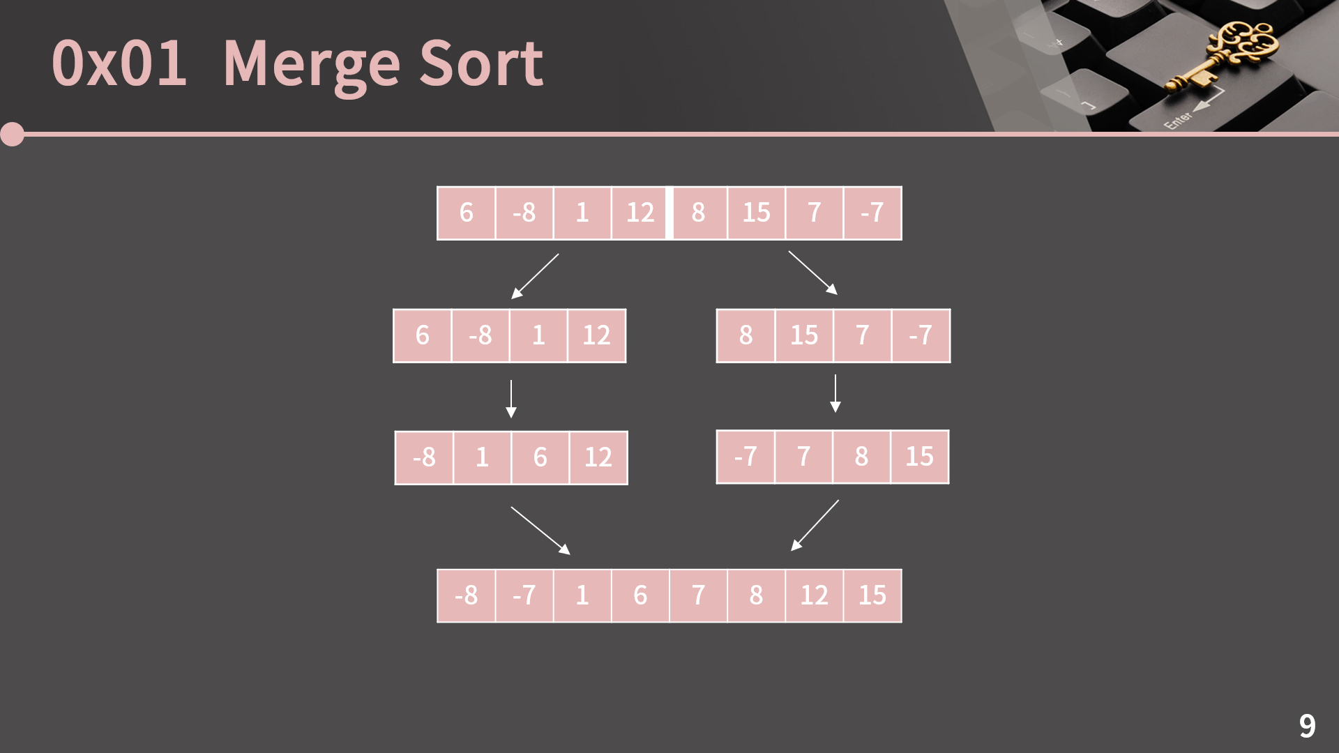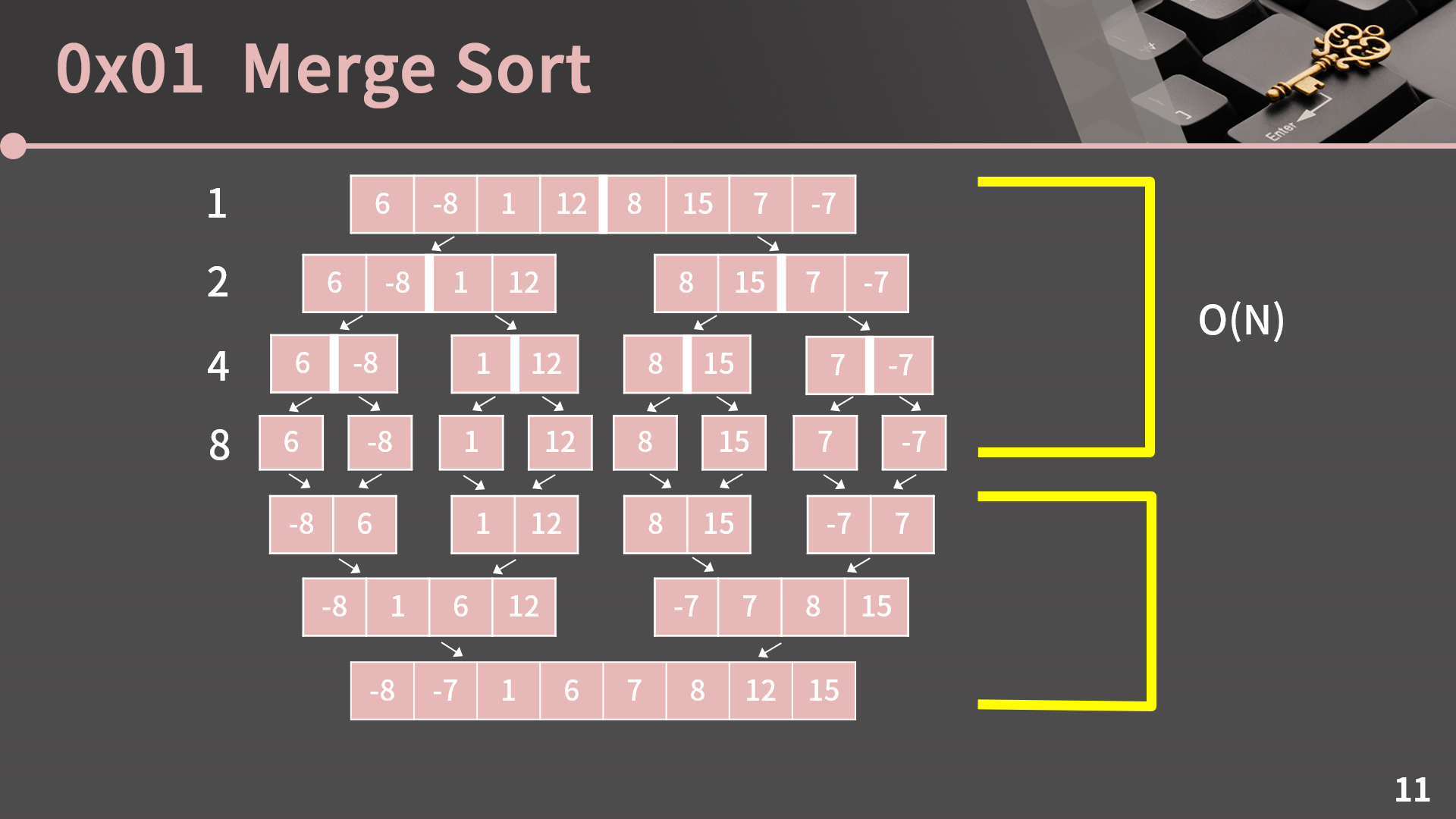 이렇게 전체 과정을 살펴보면 리스트가 분할하는 과정과 합쳐나가는 과정으로 구분할 수 있습니다. 비록 그림에서는 원소가 8개일 때를 예시로 들었지만 길이가 N = 2k라고 생각하면 됩니다.