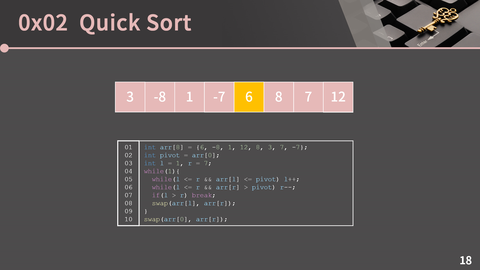 결과를 보면 pivot 왼쪽에는 3, -8, 1, -7이 있고 오른쪽에는 8, 7, 12가 됐으니 pivot이 제자리를 잘 찾아갔습니다. 이 방법이 왜 pivot을 제자리로 잘 보내는지를 이해하려면 모든 순간에 l의 왼쪽에는 pivot보다 작거나 같은 원소들만 있고 r의 오른쪽에는 pivot보다 큰 원소들만 있다는 점에 주목하면 됩니다. 그 사실을 이해하고 다시 과정을 보면 r이 l의 왼쪽에 가는 그 순간에 r과 pivot의 자리를 바꾸면 된다는걸 자연스럽게 받아들일 수 있습니다.