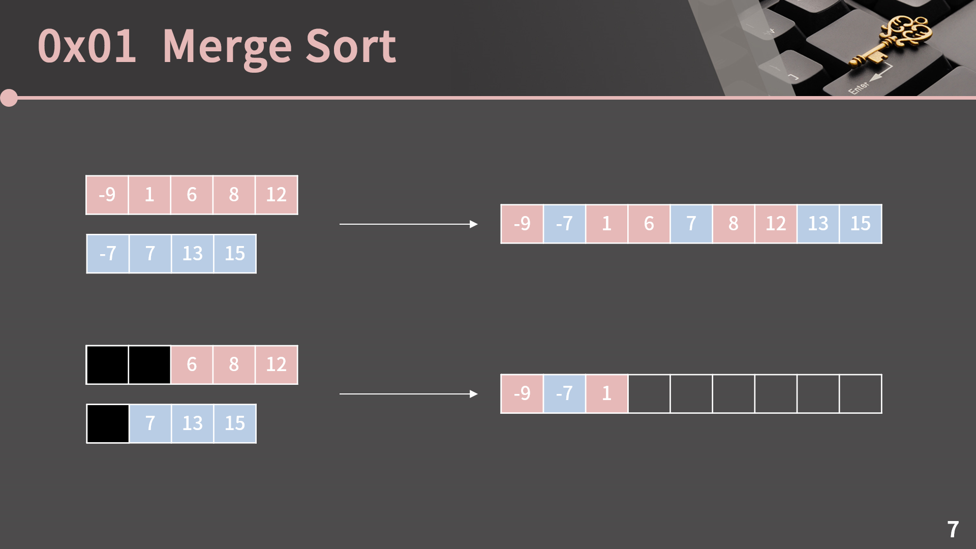 Merge Sort를 하기 위해서는 먼저 길이가 N, M인 두 정렬된 리스트를 합쳐서 길이 N+M의 정렬된 리스트를 만드는 방법을 알아야 합니다. 가장 직관적으로 떠오르는 방법은 그냥 {-9, 1, 6, 8, 12, -7, 7, 13, 15}에서 버블 정렬과 같은 방법을 사용하는건데 그렇게 되면 시간복잡도는 O((N+M)2)가 됩니다. 그런데 이것보다 훨씬 더 빠르게 할 수 있는 방법이 있습니다. 그 방법을 알아차리기 위해서는 딱 하나만 생각을 해보면 됩니다.