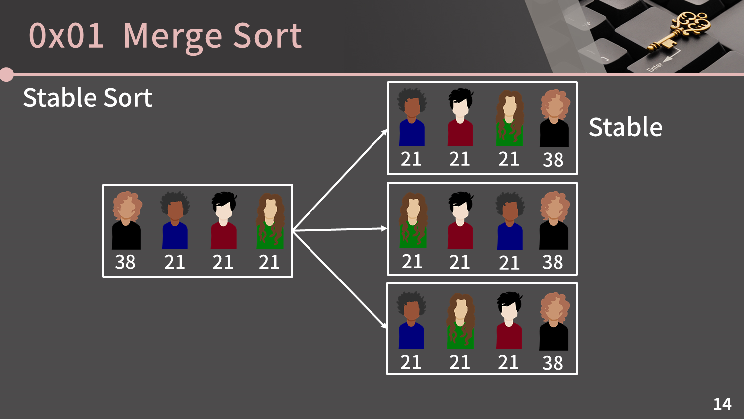 지금 이 사람들을 나이 순으로 정렬하는 상황을 생각해봅시다. 편의상 상의 색깔로 사람을 지칭하면 지금 파랑, 빨강, 초록은 나이가 21살로 다 똑같고 검정만 혼자 38살입니다. 그래서 나이 순으로 정렬을 한다치면 이 세 가지가 모두 올바른 정렬입니다. 이렇게 우선 순위가 같은 원소가 여러 개일 땐 정렬한 결과가 유일하지 않을 수 있습니다. 그런데 그 중에서 우선 순위가 같은 원소들끼리는 원래의 순서를 따라가도록 하는 정렬이 Stable Sort입니다.