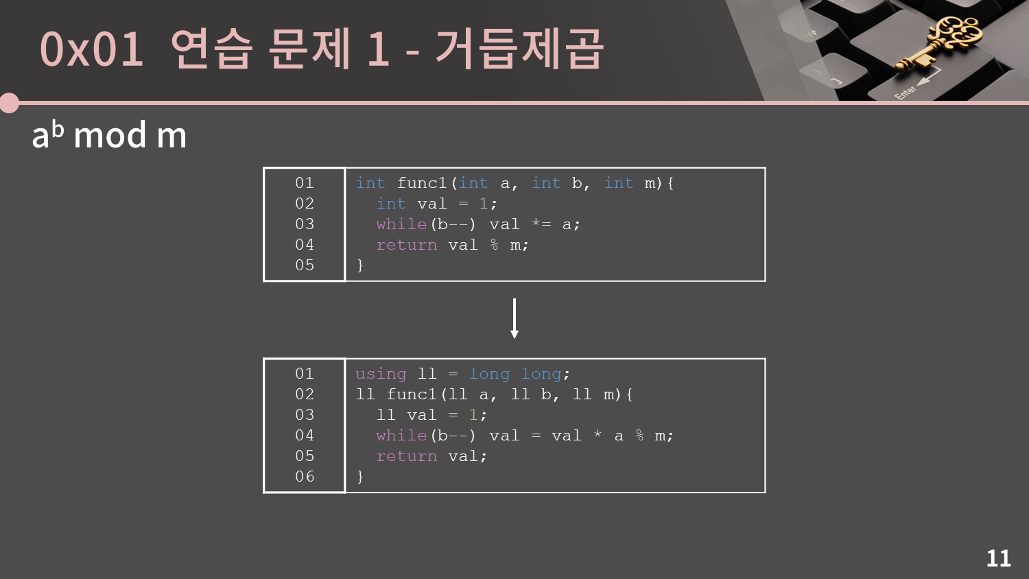 그 이유는 바로 int overflow 때문입니다. 6100은 int의 범위를 까마득하게 벗어났습니다. 이걸 해결해주려면 곱하는 중간 중간 계속 m으로 나눠서 나머지만 챙겨가면 됩니다. 왜 m으로 나눈 나머지만 챙겨가면 되는지 이해가 잘 안갈 수 있는데, 수학적으로 증명을 하려고 해도 그다지 어렵지 않게 할 수 있지만 어떤 식으로도 생각을 해볼 수 있냐면 234236116 × 268921 × 29123의 일의 자리를 구할 때 아마 대부분의 사람이 직접 저 값을 계산하는 대신 그냥 각 수의 일의 자리인 6, 1, 3만 곱한 후 답이 8이라는 것을 알아낼 것 같습니다. 왜 이렇게 계산을 하는거냐면 우리는 이미 직관적으로 a × b × c의 일의 자리, 즉 10으로 나눈 나머지는 a와 b와 c 각각의 일의 자리를 구한 후 곱하면 된다는 것을 알고 있기 때문입니다. 지금 코드도 10이 m으로 달라졌다는 것 뿐이지 우리가 상식적으로 알고있던 그 내용 그대로입니다. 그리고 type도 long long으로 바꿔주면 더 좋겠습니다. int overflow를 고려한 코드는 확인해보세요. 코드를 보면 m 미만의 수 2개를 곱하는 상황이 계속 발생하니 m이 232 보다 크다면 long long의 범위조차 넘어설 수 있습니다. 이런 상황에서는 그냥 Big Integer 기능이 있는 JAVA 혹은 Python을 사용하거나 __int128과 같은 것을 써야 하지만 정상적인 코딩테스트라면 m이 232 보다 작을 것입니다. 결론적으로 저희는 ab mod m을 O(b)에 구할 수 있습니다.
