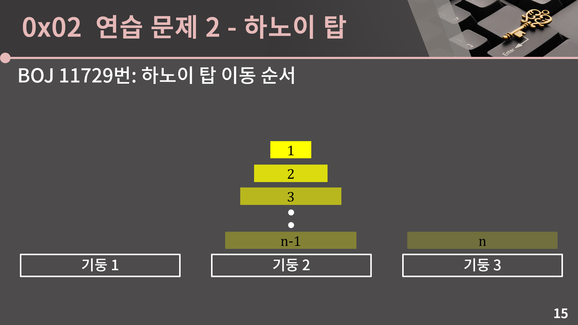 이 다음에는 무엇을 해야할지 알겠죠? n-1개의 원판을 기둥 2에서 기둥 3으로 옮기면 됩니다.