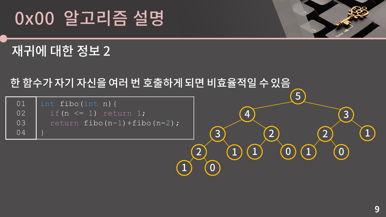 그리고 재귀 함수에 대해 또 한 가지 알고 있어야하는 점은, 재귀 함수가 자기 자신을 여러 번 호출하게 되면 예상과는 다르게 굉장히 비효율적일 수 있습니다. 지금 이 함수는 n번째 피보나치 수열을 반환하는 함수입니다. 피보나치 함수는 초항 2개가 1 1이고 그 뒤의 항들은 직전 항 2개의 합으로 정의되는 함수인데 처음 들어보시면 한 번 찾아보고 오시면 됩니다.