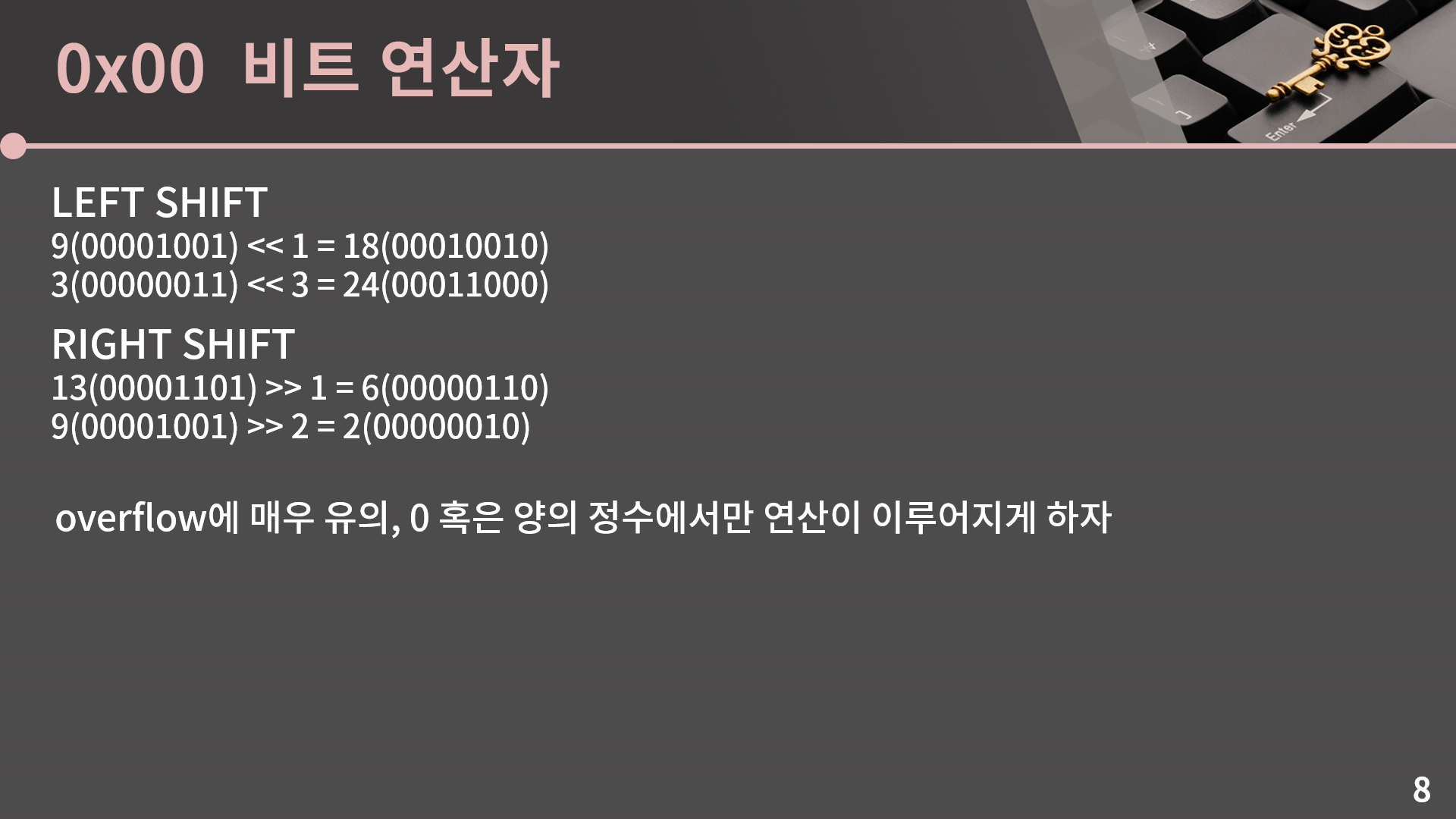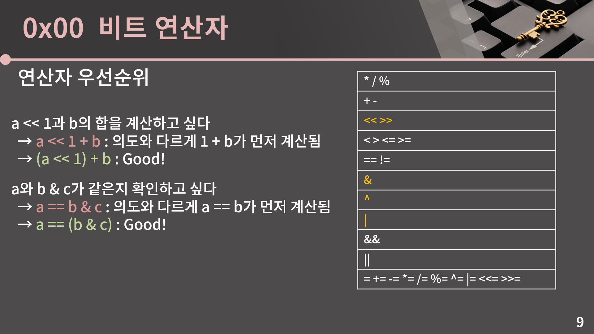 그러니까 되게 간단한건데, 예를 들어서 9 & 14라고 하면 9는 비트로 표현했을 때 00001001이고 14는 00001110입니다. 그러면 각 자리별로 &를 수행을 하면 되고 오른쪽에서 4번째 비트, 즉 8에 대응되는 비트만 1이 되어서 9 & 14 = 8입니다. 나머지 예시들도 한 번 확인을 해보시면 될거고, 여기서 NOT이 살짝 신기한 성질을 가지고 있는데, signed 자료형에서는 ~x = -x – 1입니다. 그러니까 ~16은 -17입니다. 이걸 어떤 관점에서 이해를 할 수가 있냐면 ~x와 x를 더했다 치면 각 비트가 다 1이 됩니다. x에서 0이었던 자리는 ~x에서 1이고 또 x에서 1이었던 자리는 ~x에서 0이기 때문에. 그리고 signed 자료형에서 11111111은 -1입니다. 그래서 ~x + x = -1이고 x를 넘기면 ~x = -x – 1이라는 식이 나옵니다. 일단 상황은 이렇고, 그런데 저는 사실 NOT을 잘 안써서 한번씩 남의 코드에서 NOT이 나오면 순간 이거 계산 결과가 어떻게 되더라? 하고 머리를 굴리곤 합니다. 그래서 좀 헷갈린다 싶으면 NOT은 굳이 안쓰셔도 상관은 없습니다.