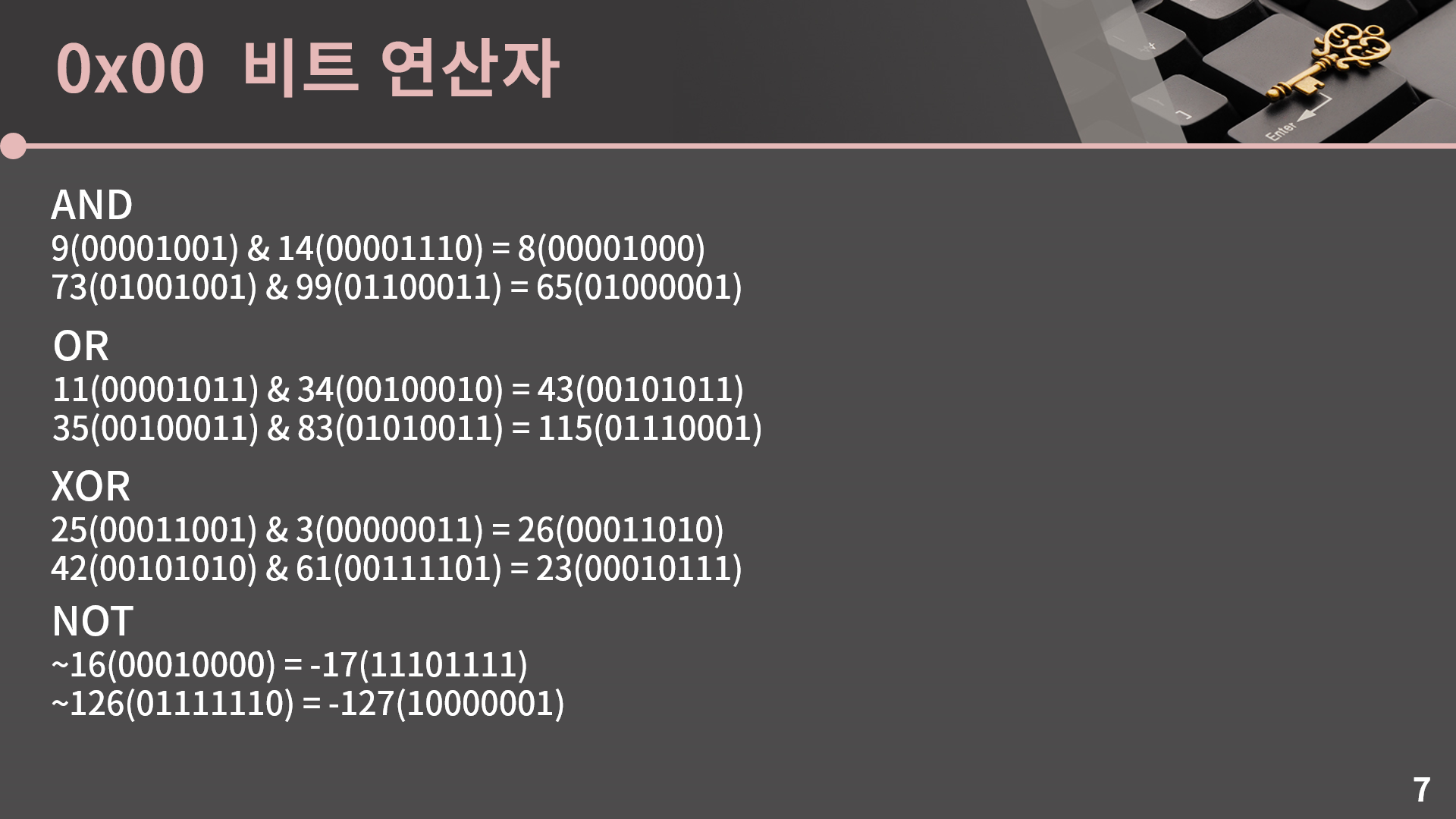 다음으로 앞에서 본걸 char에서 해보겠습니다. int나 long long도 똑같습니다. 0x01강 – 기초 코드 작성 요령 I에서 정수 자료형 관련해서 설명드린걸 잠깐 다시 봅시다. 이거 표 자체를 예전 ppt에서 그대로 가져온건데, 뭔가 4년 전의 저랑 지금의 저랑 미적 감각이 약간 다릅니다. 저때는 검정이랑 노랑이랑 섞으면 되게 명시성이 높다 해야하나 쨍하게 잘 보이니까 노랑 주황 이런걸 많이 썼는데 지금보니 좀 눈이 아픈 것 같기도 하고. 아무튼 char는 8개의 비트로 표현이 되는데 각 자리가 나타내는 값은 오른쪽부터 2^0, 2^1, .., 2^6, 그리고 제일 왼쪽에 -2^7이 있다는 그런 얘기를 했습니다. 그러면 9는 00001001로 표현이 가능합니다. 그리고 char에서 AND, OR, XOR, NOT과 같은 비트 연산을 한다고 치면 각 자리별로 그 연산을 수행을 하면 됩니다.